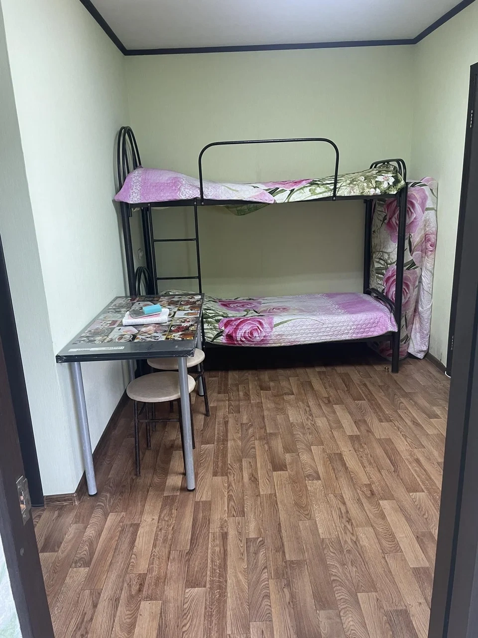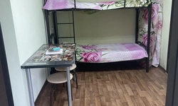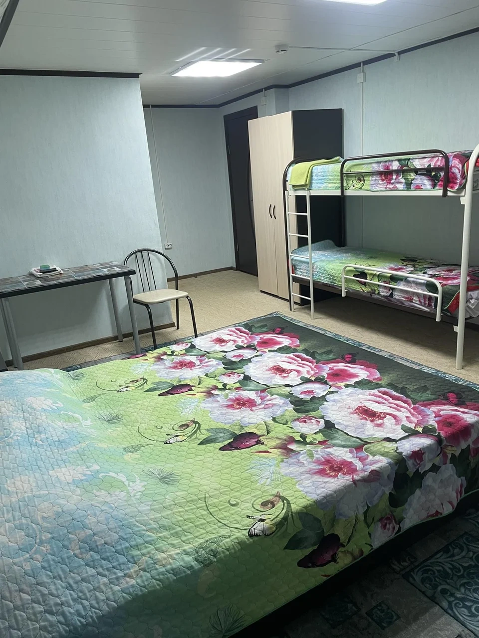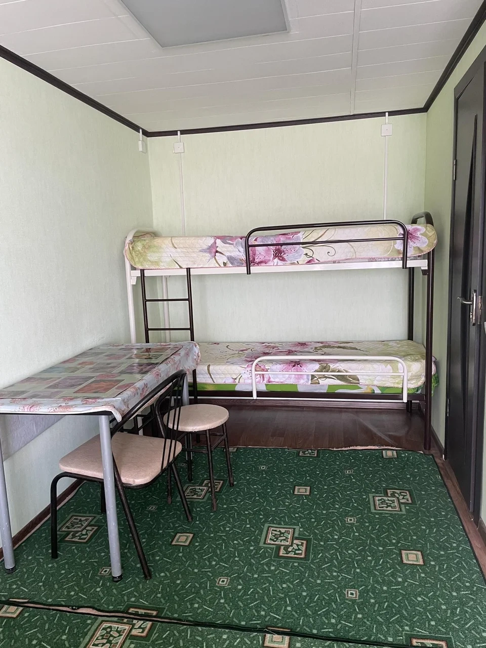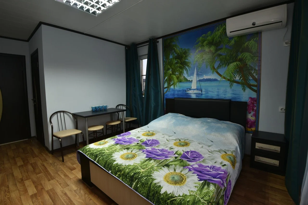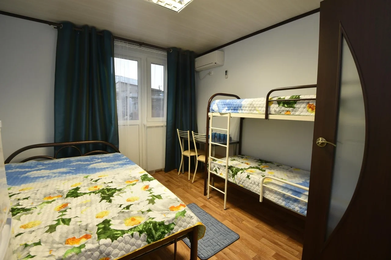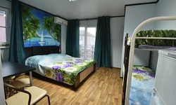 Одна двуспальная кровать, одна двухъярусная кровать, шкаф, тумбочка, телевизор, холодильник, санузел с душем, сплит-система, кухня в номере, стол, балкон.