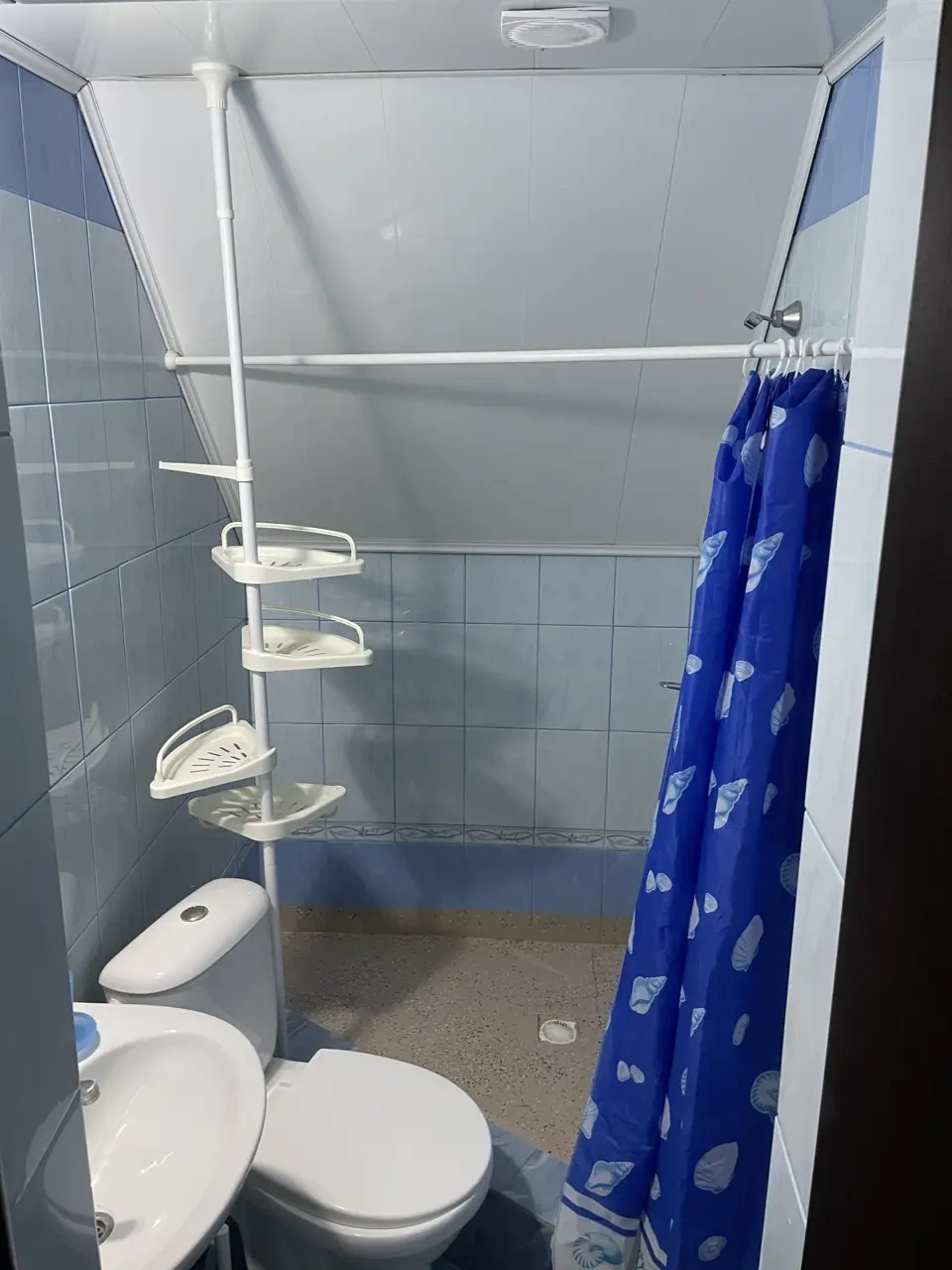 Одна двуспальная кровать, одна двухъярусная кровать, шкаф, тумбочка, телевизор, холодильник, санузел с душем, сплит-система, стол, терраса