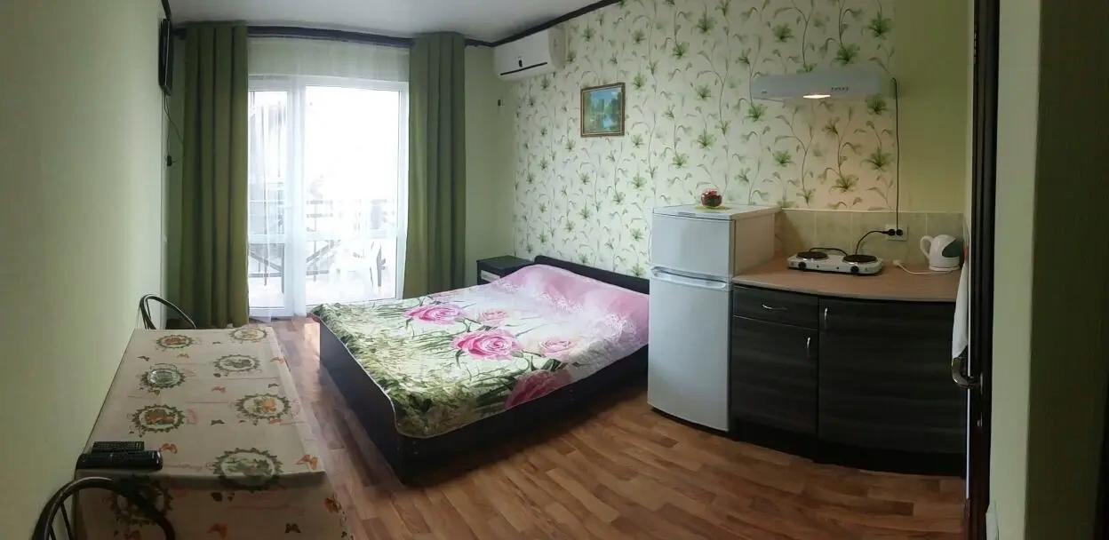 Двуспальная кровать, шкаф, тумбочка, телевизор, холодильник, санузел с душем, сплит-система, кухня в номере, стол, балкон
