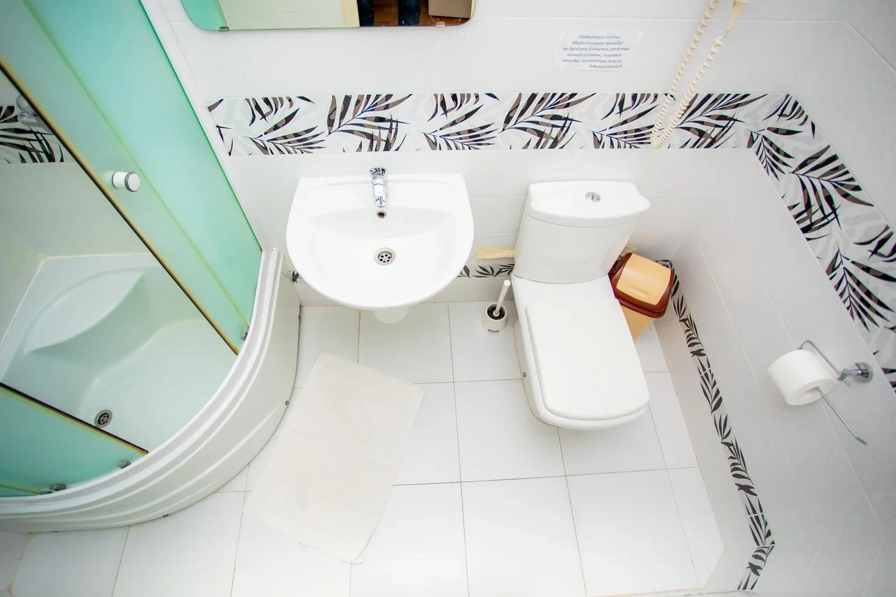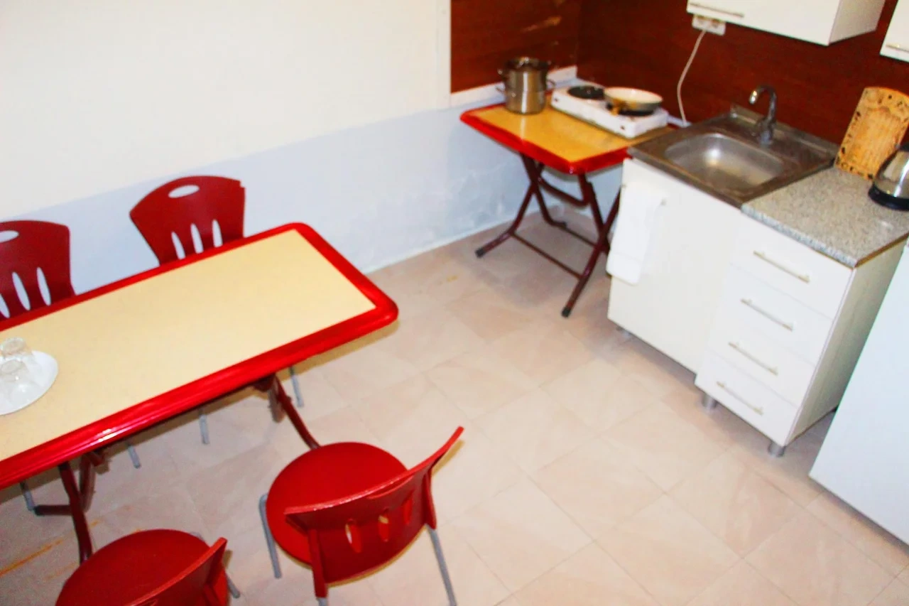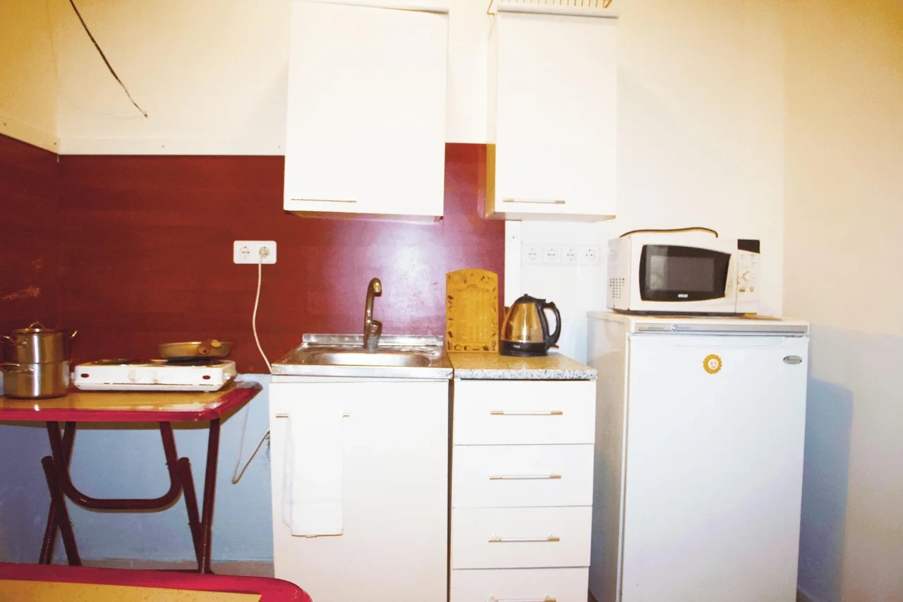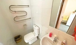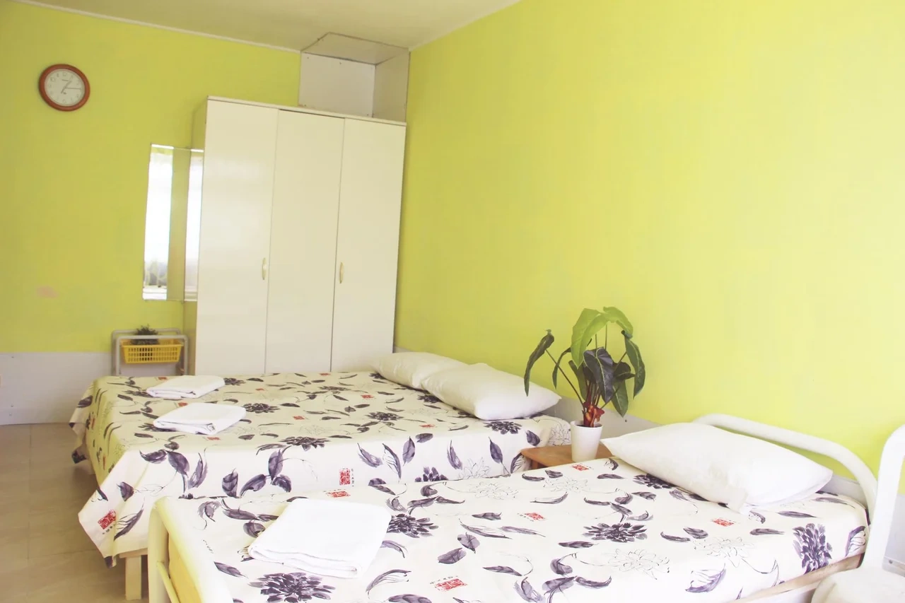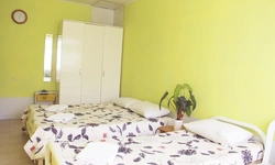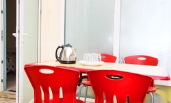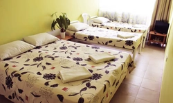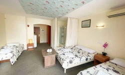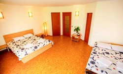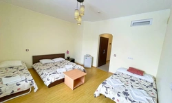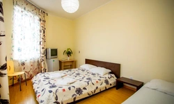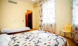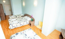 Однокомнатный номер с двуспальной кроватью и двумя односпальными кроватями. В номере: стол, стул, прикроватные тумбочки, шкаф , телевизор, холодильник, журнальный столик, сушилка для белья. Площадь номера 18м2. Санузел в номере, отдельно расположена душевая кабина за шторой. Номер расположен на уровне земли и имеет два входа с улицы, и из общего коридора. В распоряжении гостей общая обеденная зона с набором посуды, микроволновкой и куллером с кпятком.