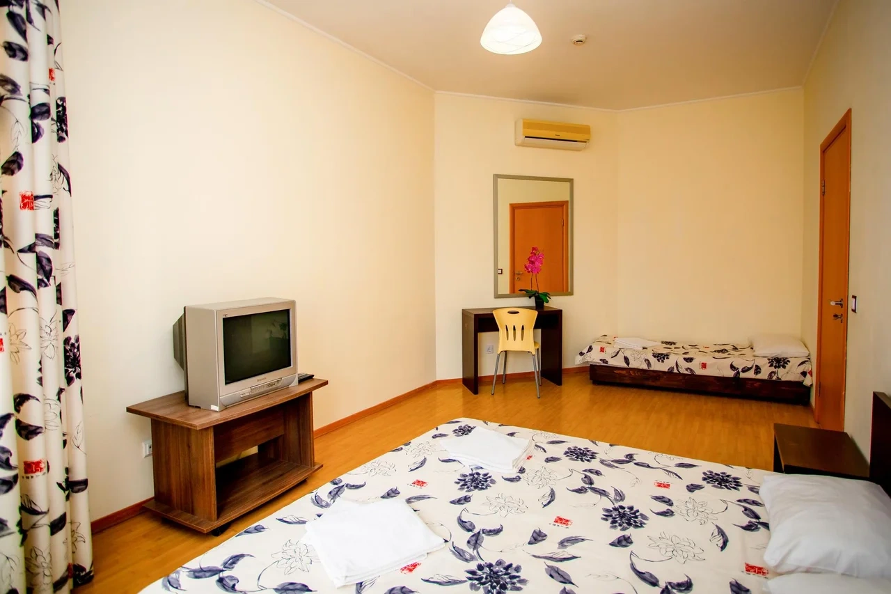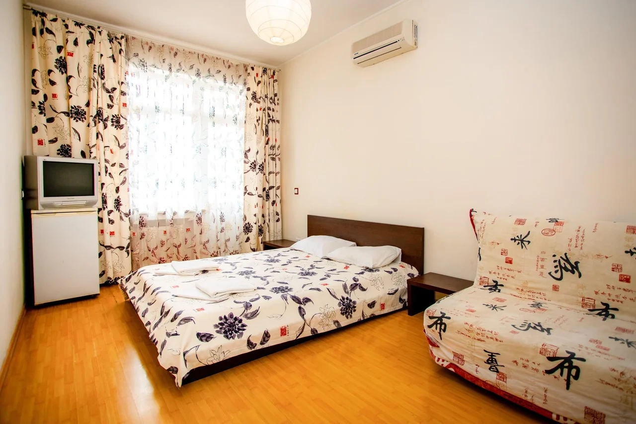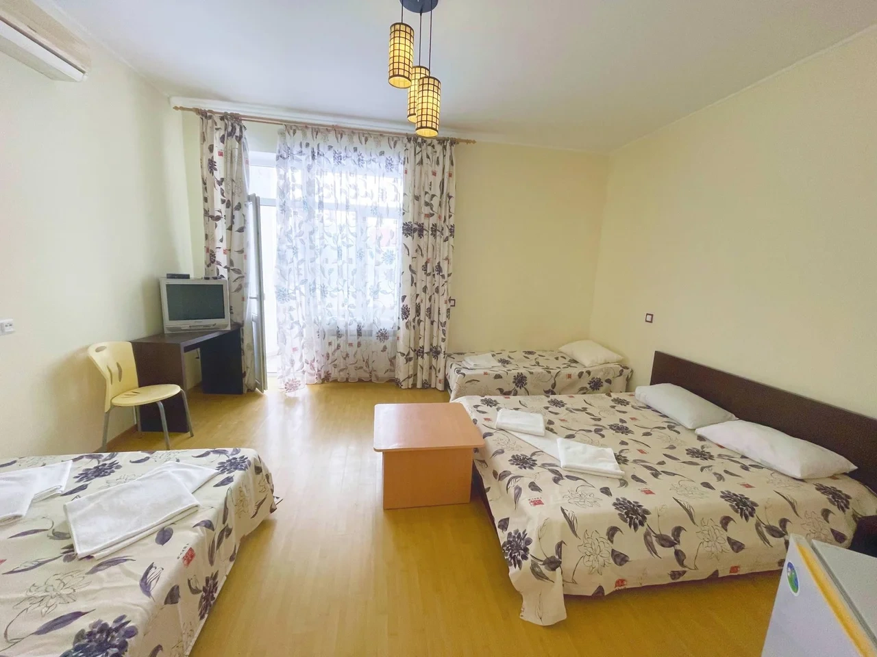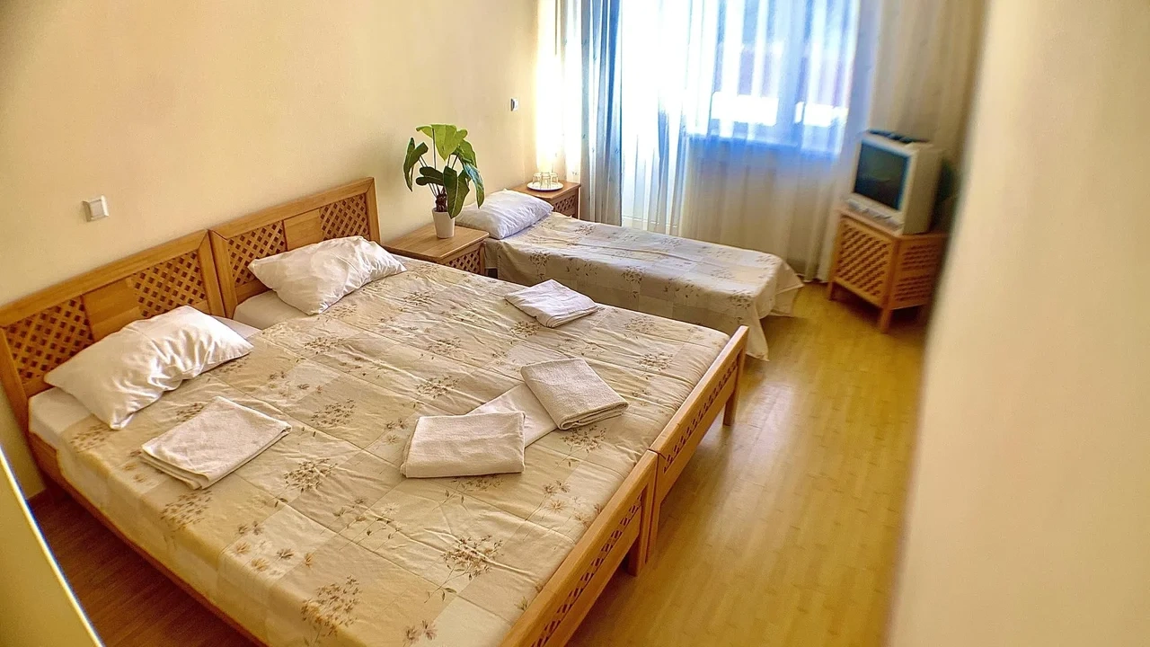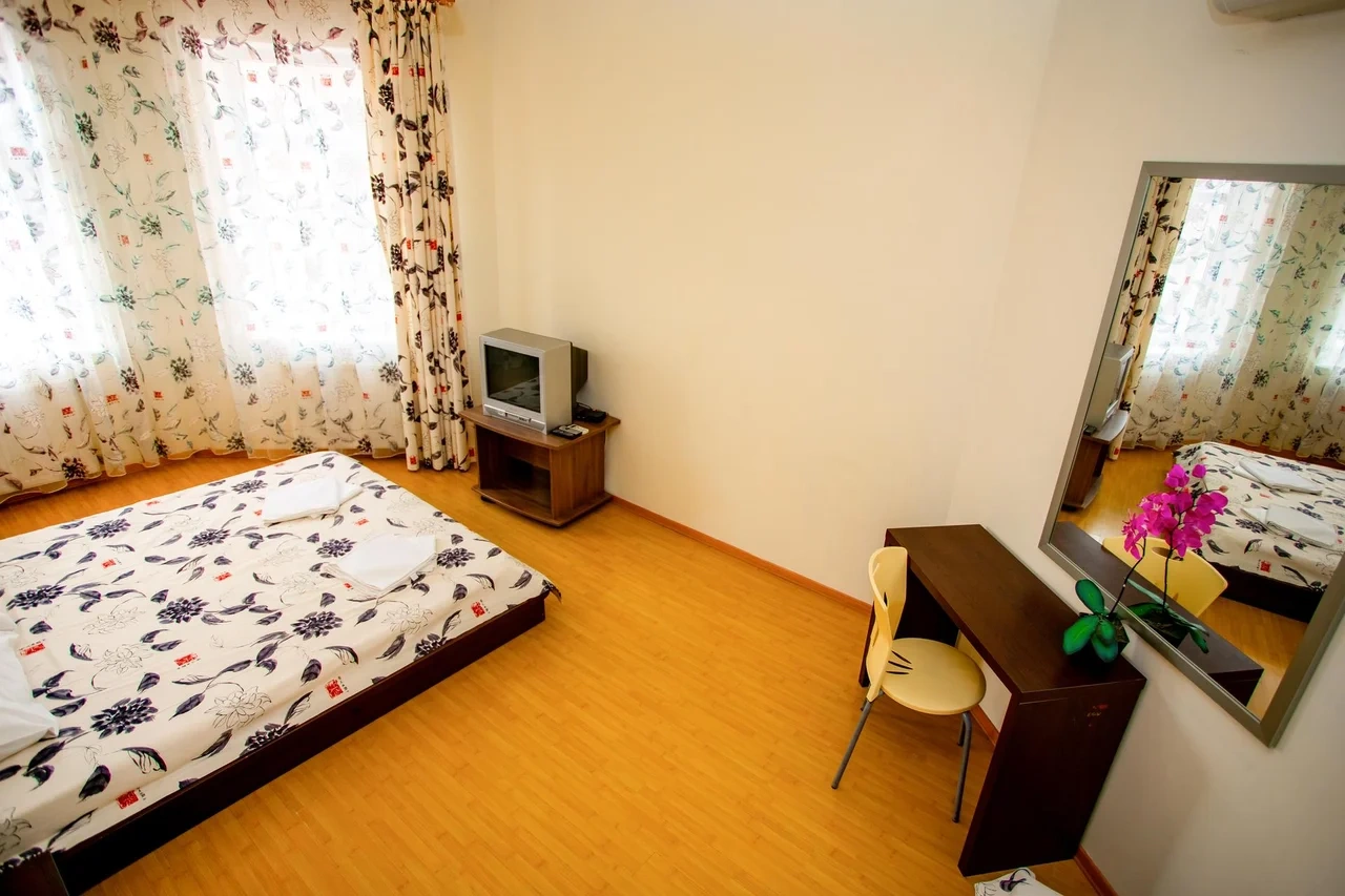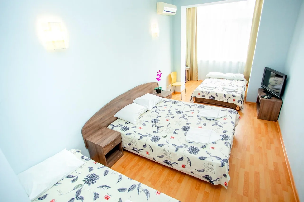 Однокомнатный номер с двуспальной кроватью и диван-кроватью шириной 120см. В номере: прикроватные тумбочки, шкаф, телевизор, холодильник, сплит – система, сан. узел с ванной. Площадь трехместного номера 18м2. На балконе стол и два стула. Москитные сетки на окнах.