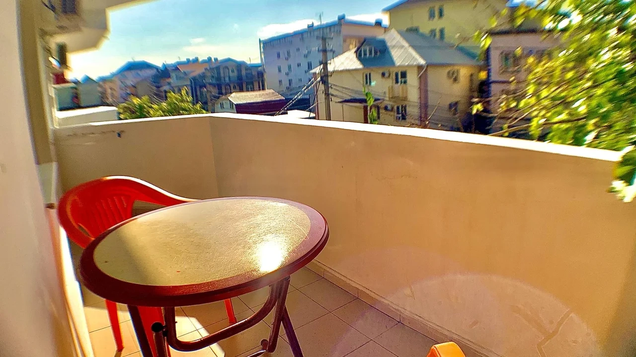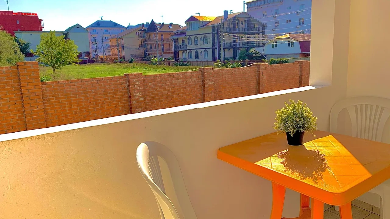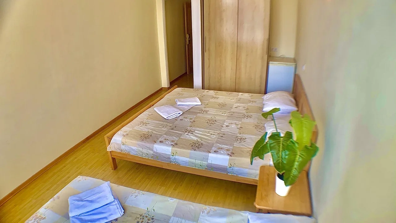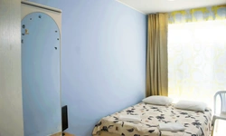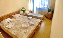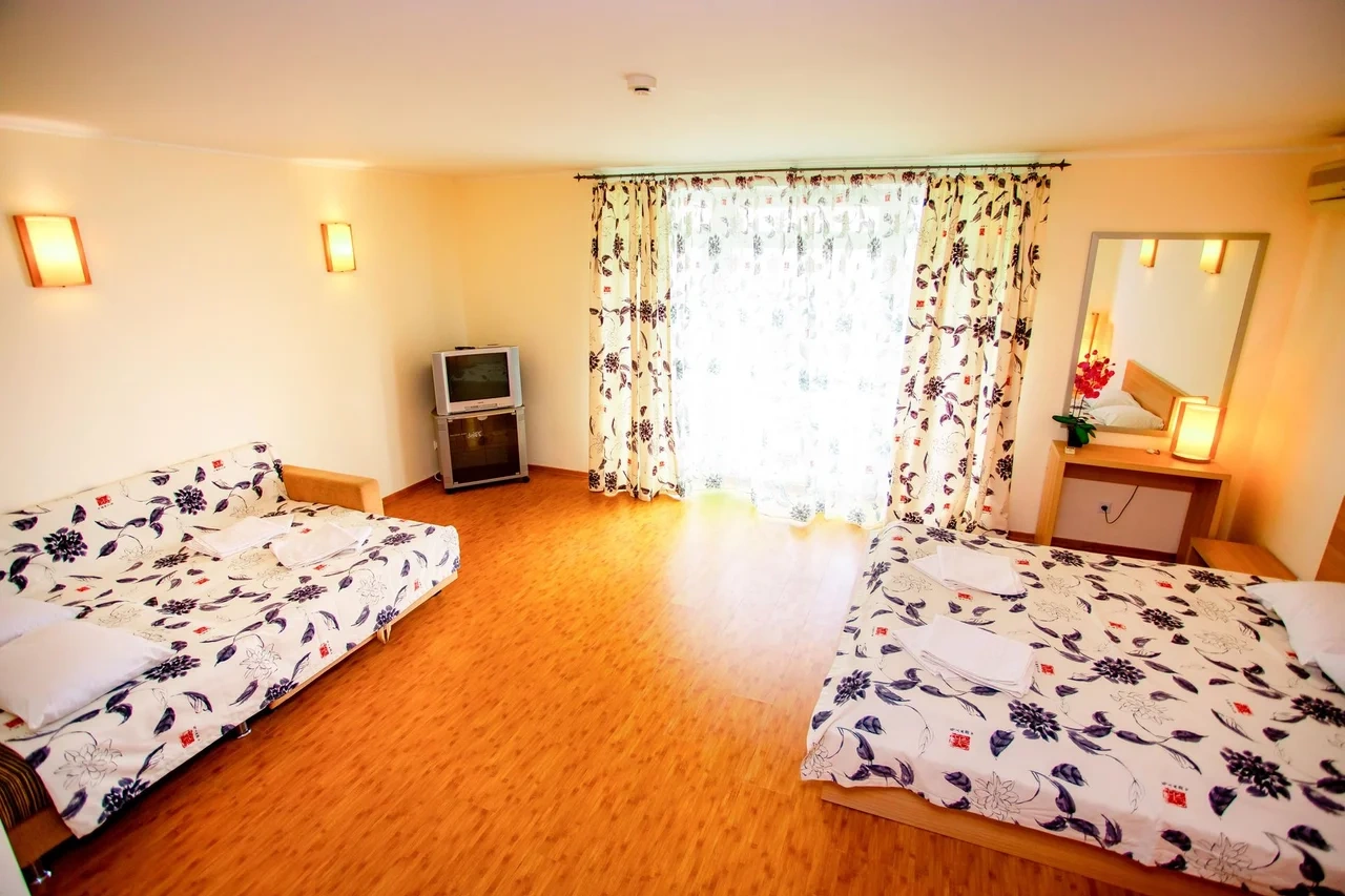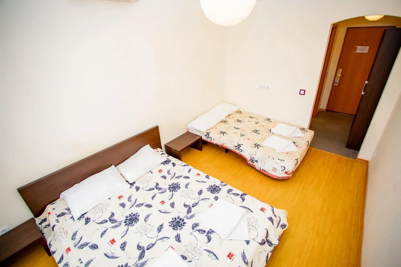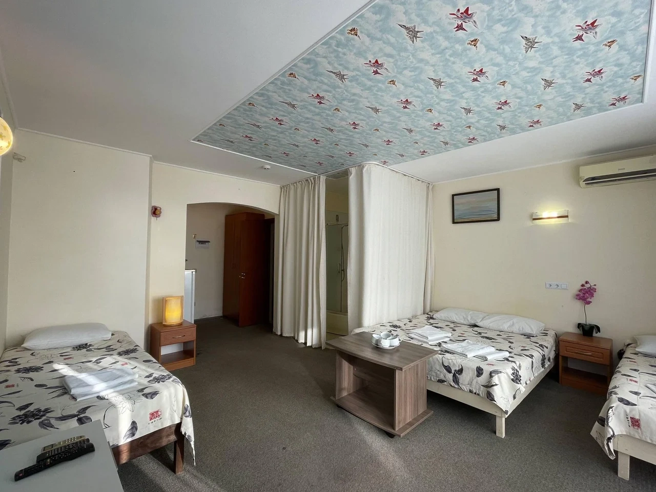 Однокомнатный номер с двуспальной кроватью и диван-кроватью шириной 120см. В номере: прикроватные тумбочки, шкаф, телевизор, холодильник, сплит – система, сан. узел с ванной. Площадь трехместного номера 18м2. На балконе стол и два стула. Москитные сетки на окнах.