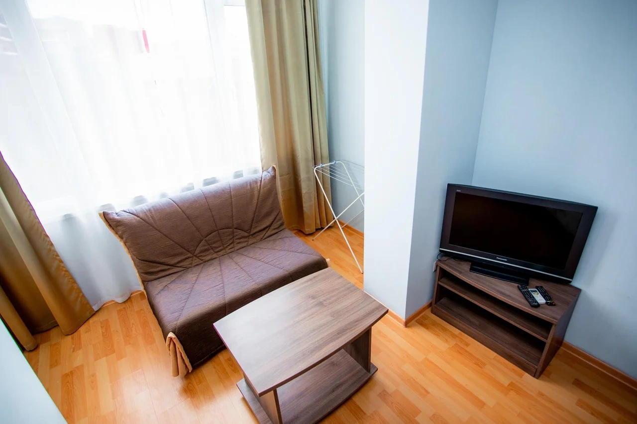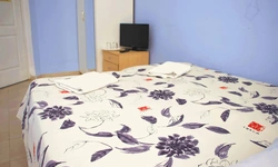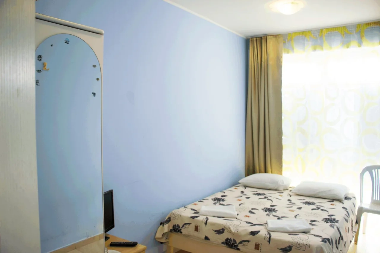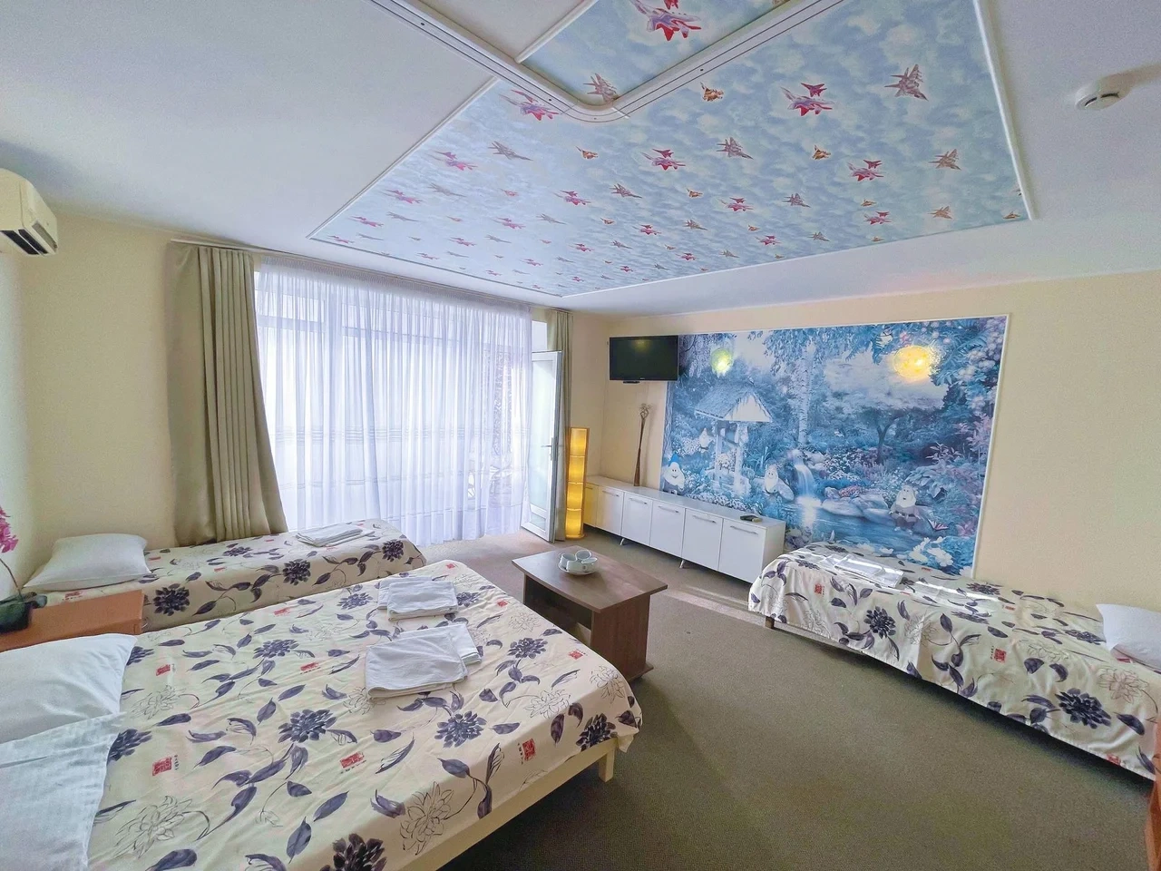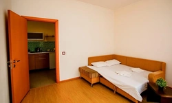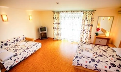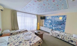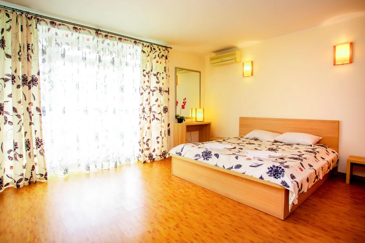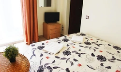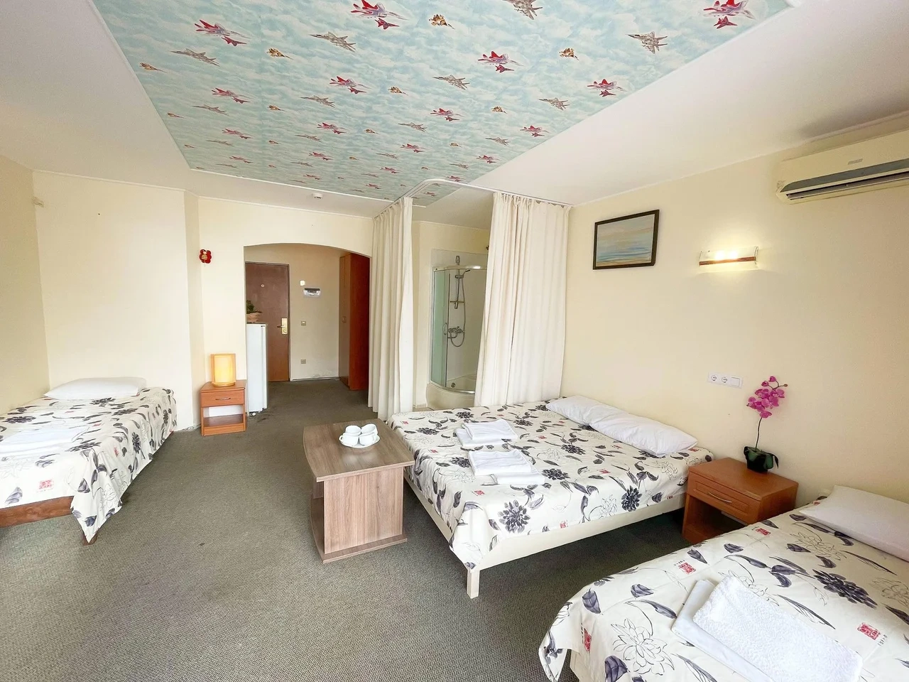 Однокомнатный номер с двуспальной кроватью и диван-кроватью шириной 120см. В номере: прикроватные тумбочки, шкаф, телевизор, холодильник, сплит – система, сан. узел с ванной. Площадь трехместного номера 18м2. На балконе стол и два стула. Москитные сетки на окнах.