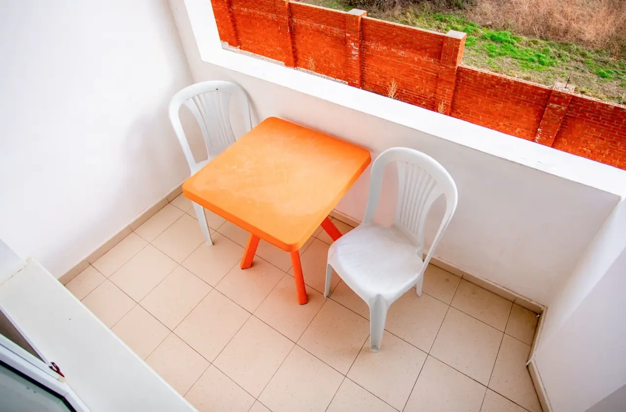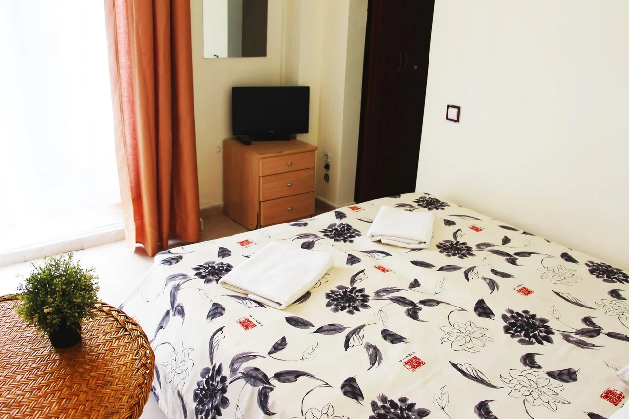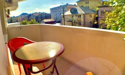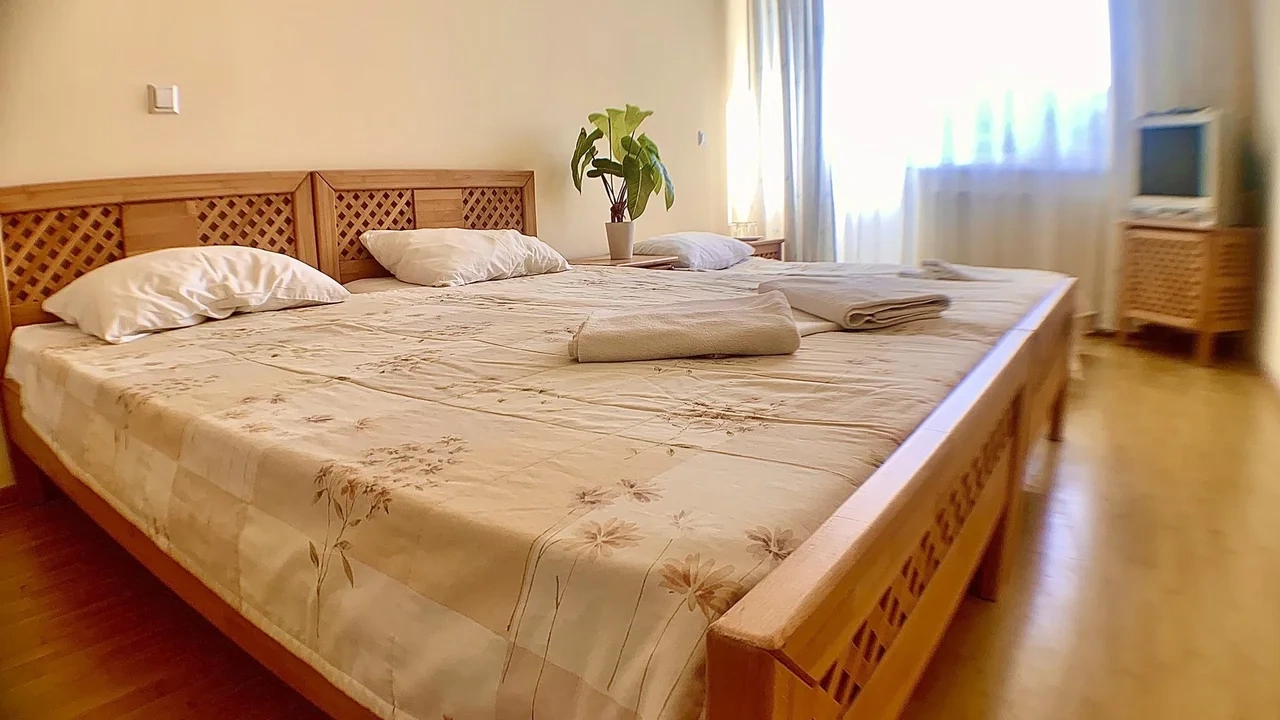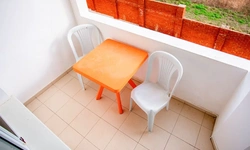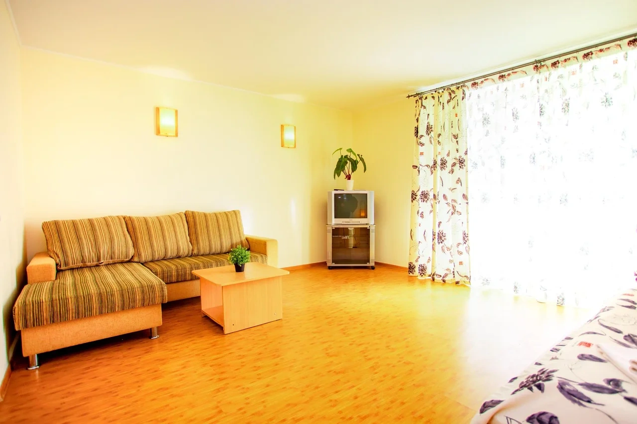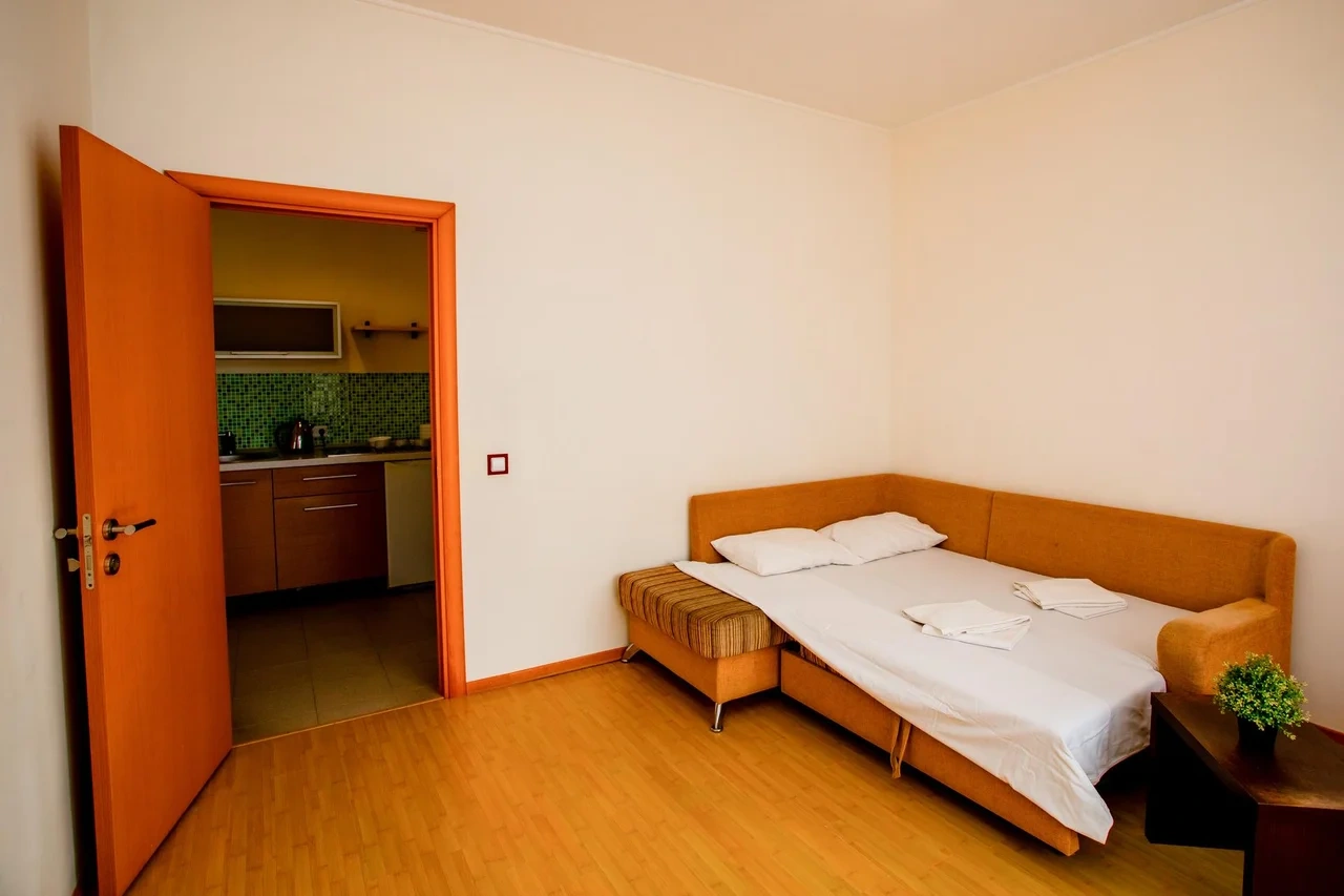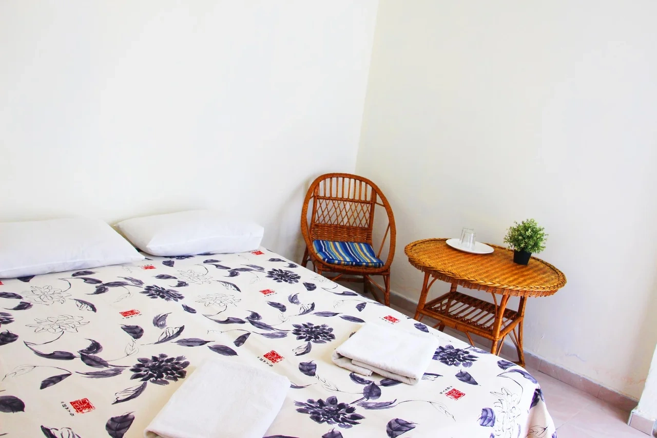 Однокомнатный номер с двуспальной кроватью и диван-кроватью шириной 120см. В номере: прикроватные тумбочки, шкаф, телевизор, холодильник, сплит – система, сан. узел с ванной. Площадь трехместного номера 18м2. На балконе стол и два стула. Москитные сетки на окнах.