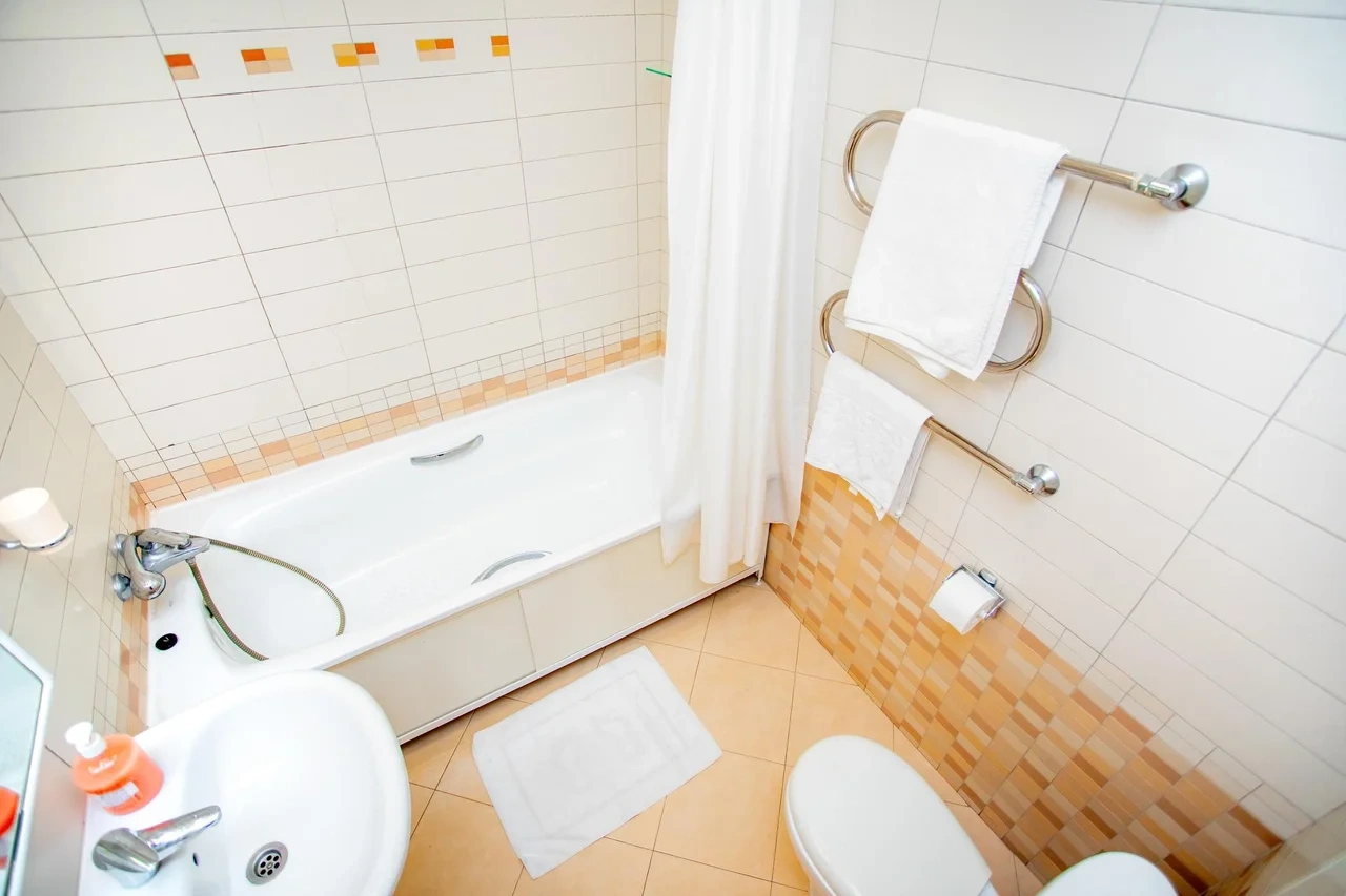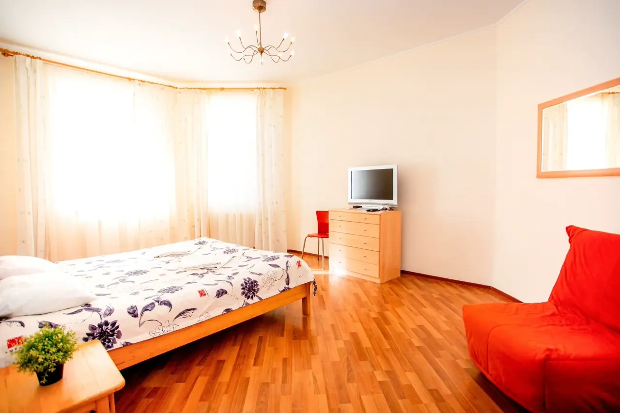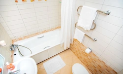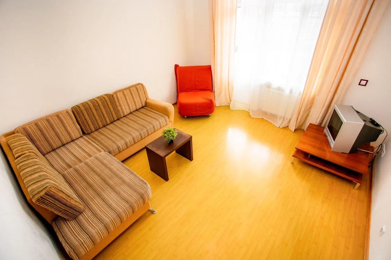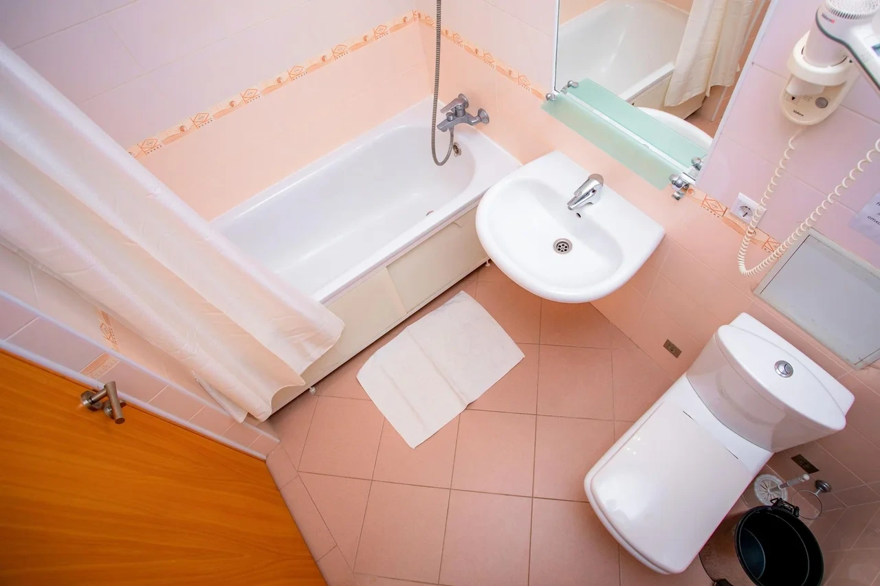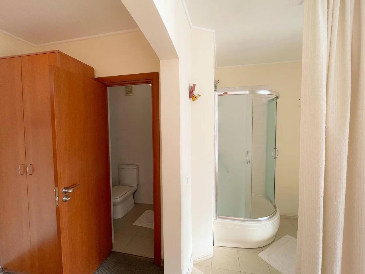 Однокомнатный номер с двуспальной кроватью и диван-кроватью шириной 120см. В номере: прикроватные тумбочки, шкаф, телевизор, холодильник, сплит – система, сан. узел с ванной. Площадь трехместного номера 18м2. На балконе стол и два стула. Москитные сетки на окнах.