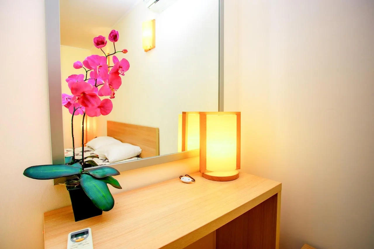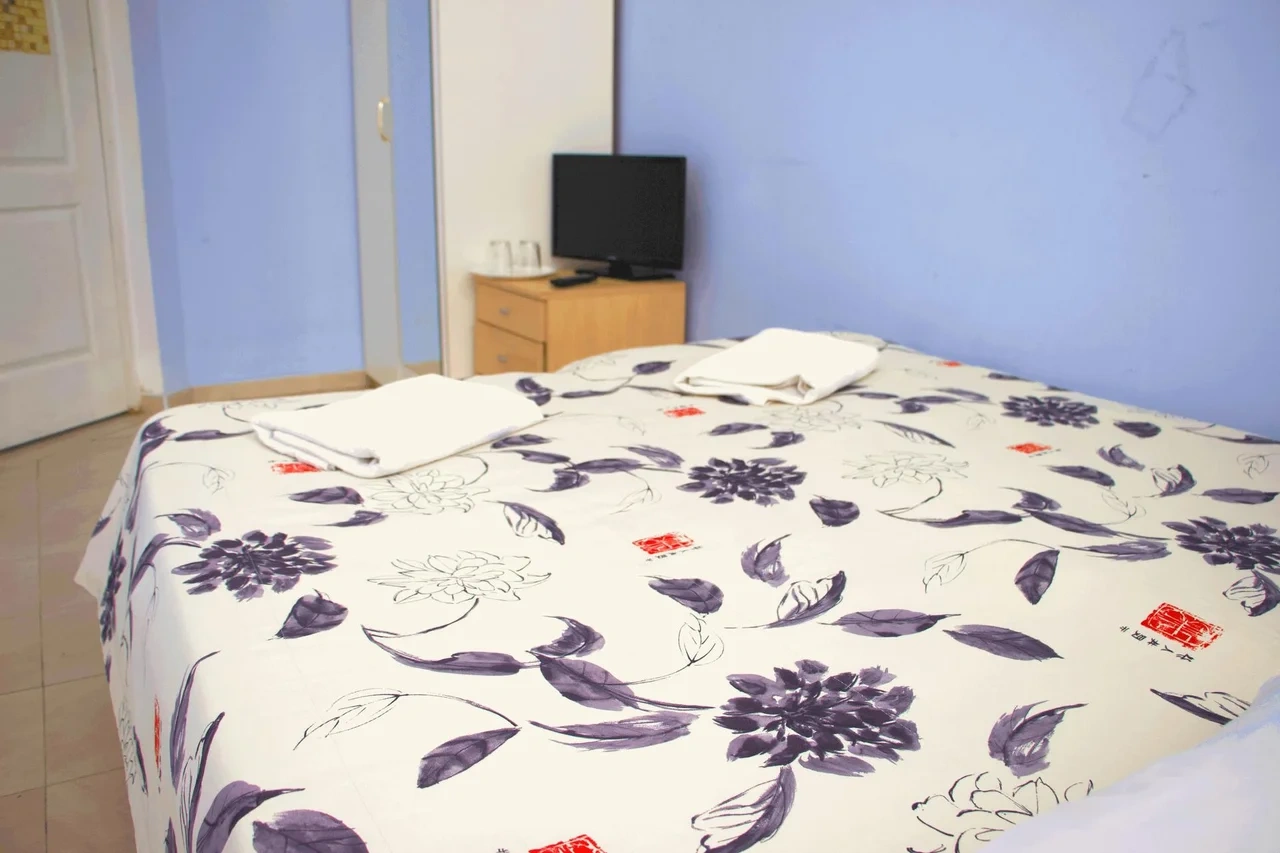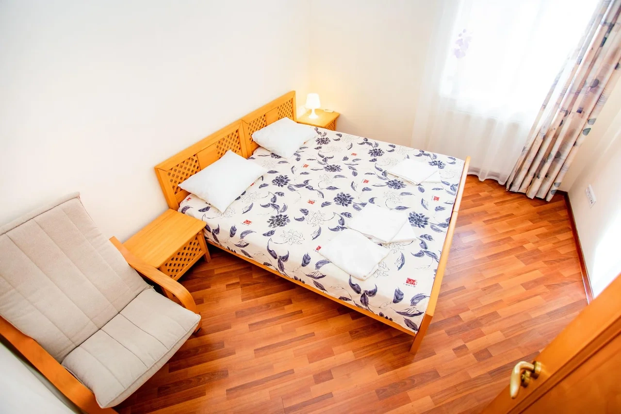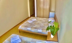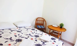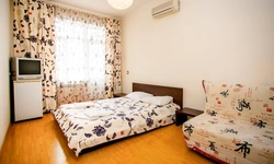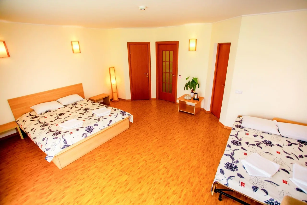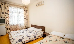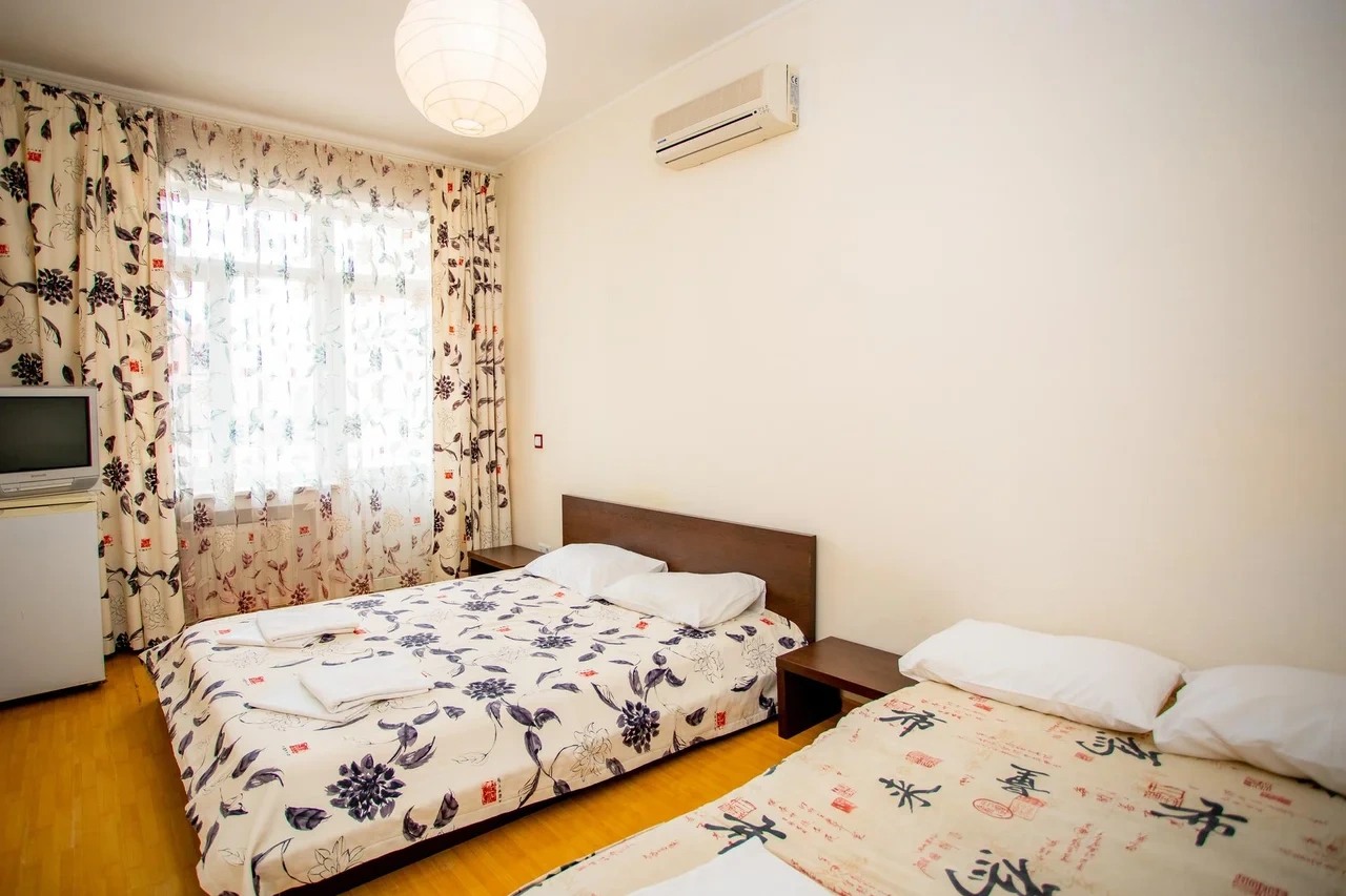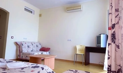 Однокомнатный номер с двуспальной и односпальной кроватями площадью 16м2. В номере: прикроватные тумбочки, шкаф , телевизор, холодильник, сплит – система, сан. узел с душем, сушилка для белья. Москитные сетки на окнах.