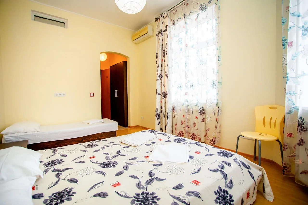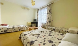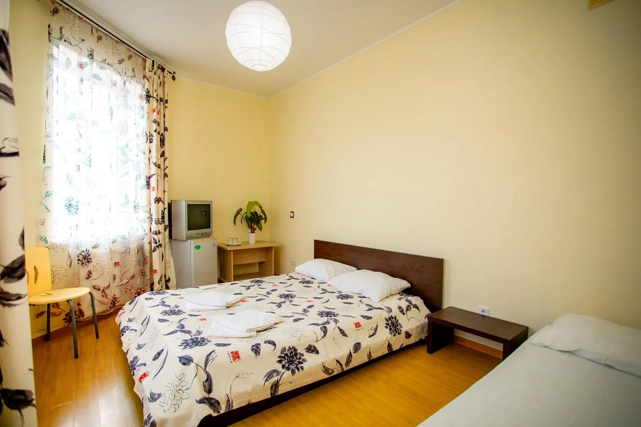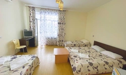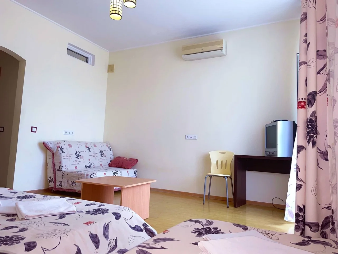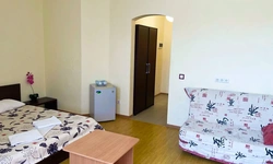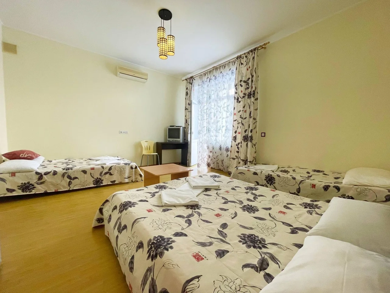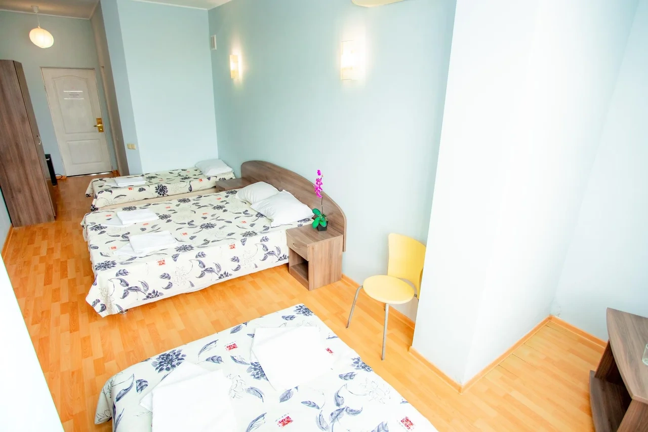 Однокомнатный номер с двуспальной и односпальными кроватями, диван-кровать шириной 120см. В номере: стол, стул, прикроватные тумбочки, шкаф , телевизор, холодильник, журнальный столик. Москитные сетки на окнах. Площадь номера 24м2. Санузел в номере. Номер с балконом, расположен на 3-м этаже. В распоряжении гостей общая обеденная зона с набором посуды, микроволновкой и куллером с кпятком.