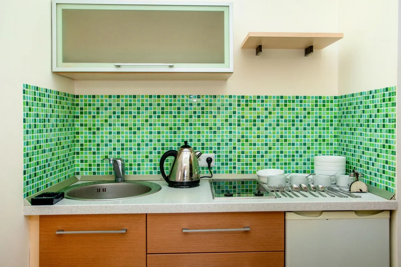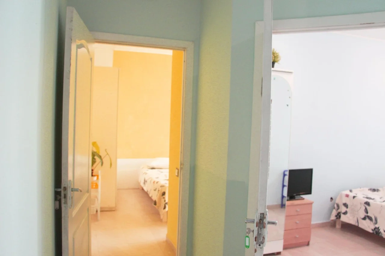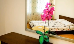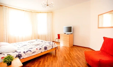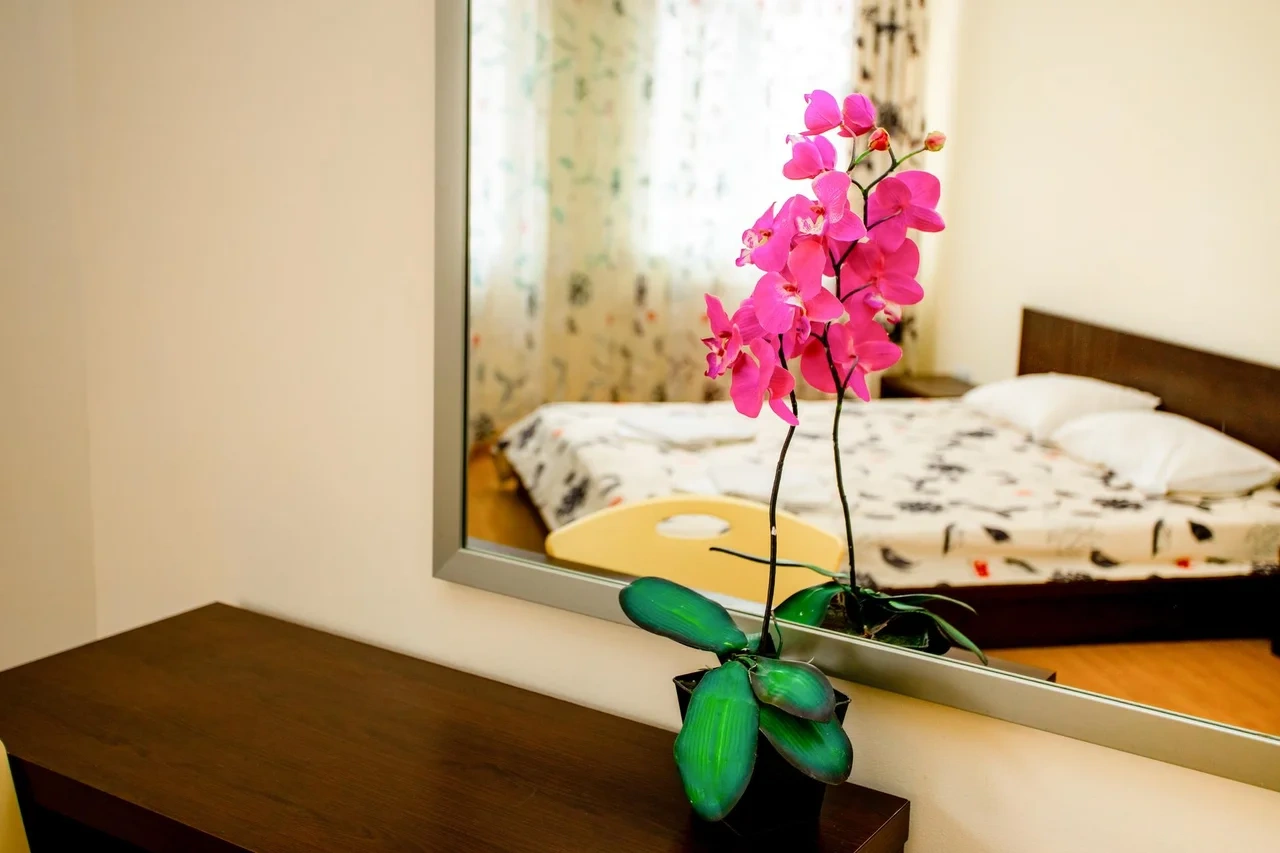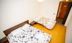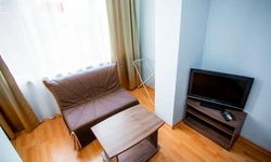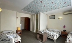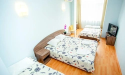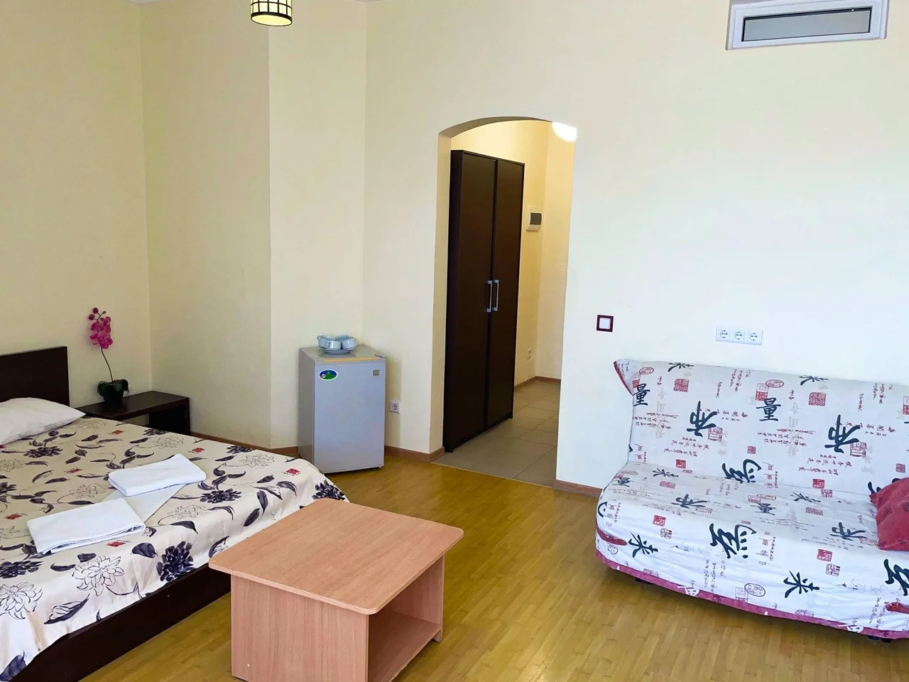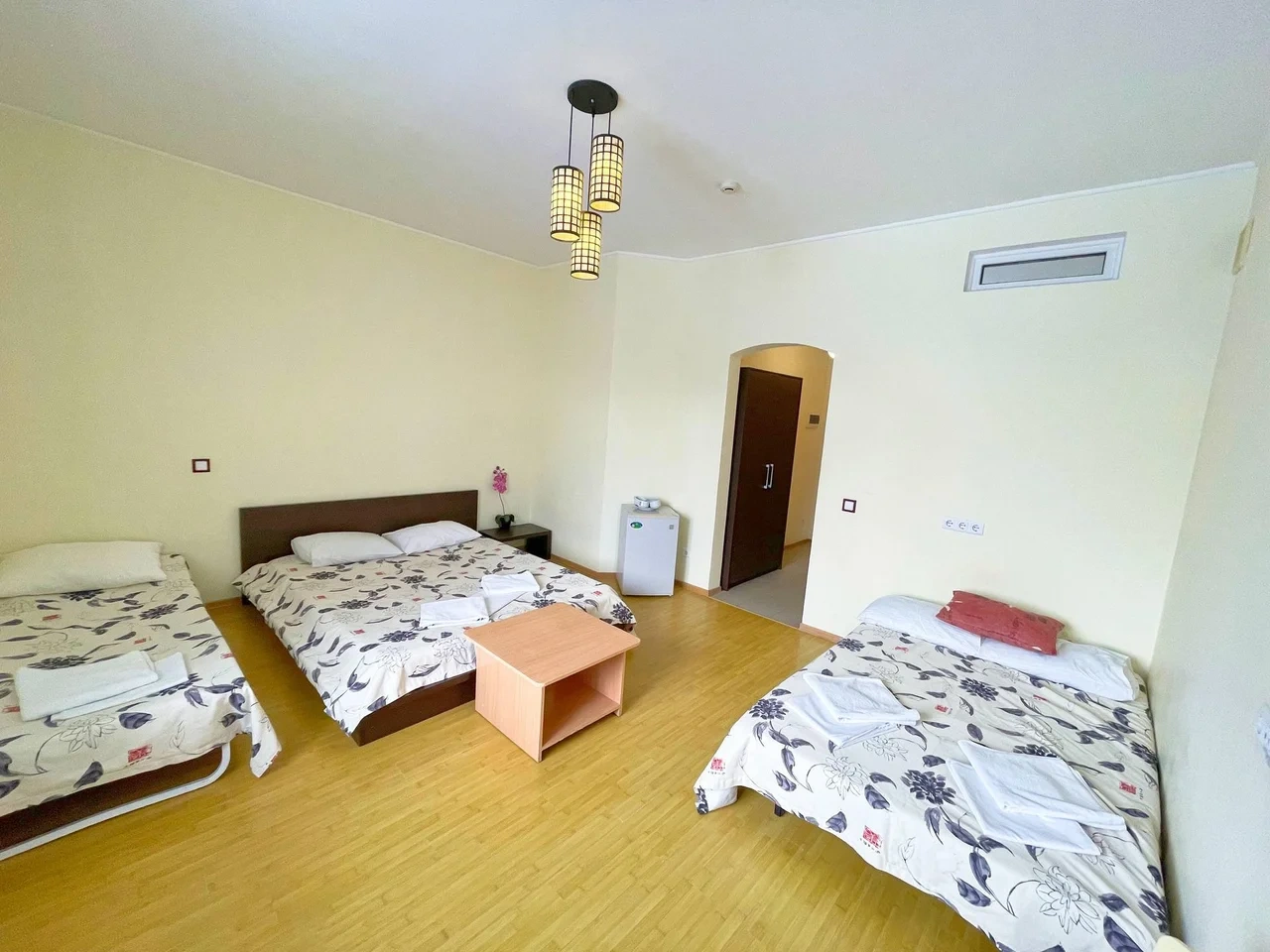 Однокомнатный номер с двуспальной и односпальными кроватями, диван-кровать шириной 120см. В номере: стол, стул, прикроватные тумбочки, шкаф , телевизор, холодильник, журнальный столик. Москитные сетки на окнах. Площадь номера 24м2. Санузел в номере. Номер с балконом, расположен на 3-м этаже. В распоряжении гостей общая обеденная зона с набором посуды, микроволновкой и куллером с кпятком.