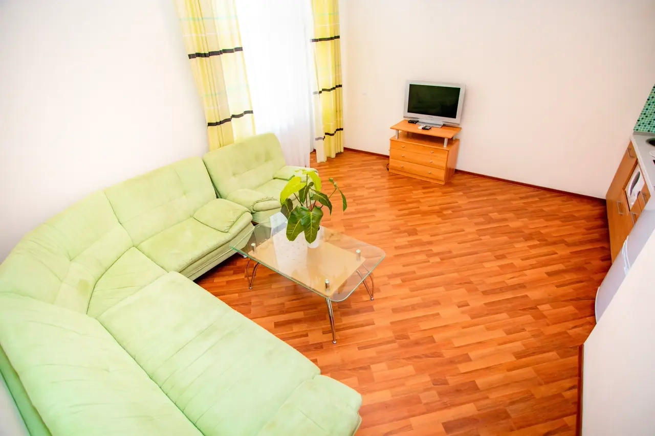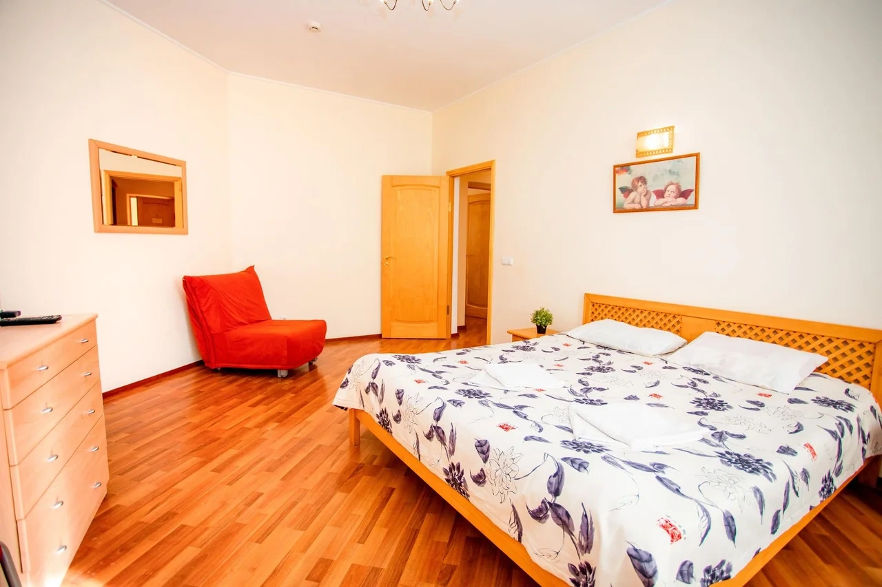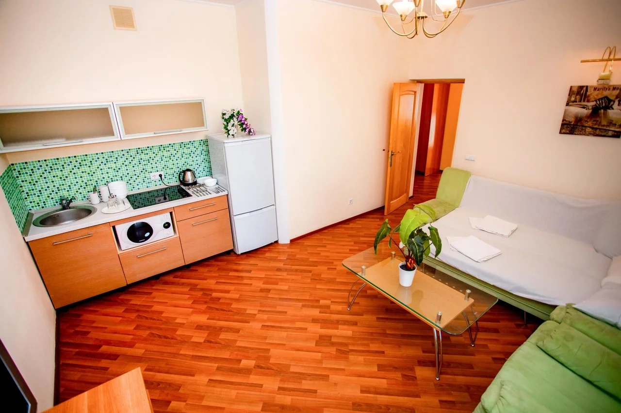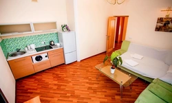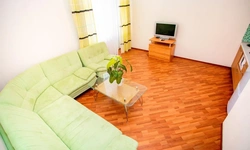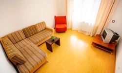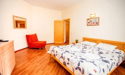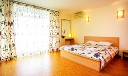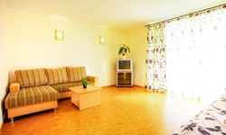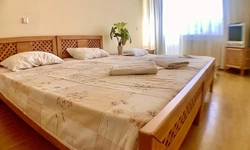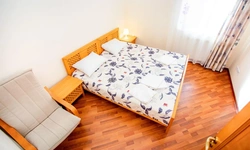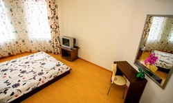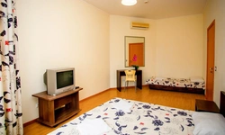 В номере две изолированные комнаты и мини кухня. В одной комнате двуспальная и односпальная кровати, стол, зеркало, прикроватные тумбочки. Во второй двуспальный угловой диван, кресло-кровать, тумба, телевизор. В прихожей шкаф. Кухня оборудована жарочной панелью, чайником и холодильником, необходимой посудой и столовыми приборами. В санузле ванная. Однокомнатный номер с двумя односпальными кроватями (сдвинуты, можно раздвинуть) или двуспальной кроватью, во многих номерах установлена дополнительная кровать. В номере: стол, 2-е табуретки, прикроватные тумбочки, шкаф , телевизор, холодильник, сплит – система, сан. узел с душевой. Площадь номера 40м2. На балконе стол и два стула. Москитные сетки на окнах. Сплит-системы в каждой комнате.