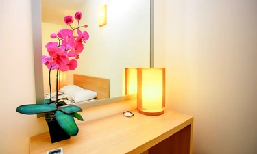 Однокомнатный номер с большой двуспальной кроватью, односпальной кроватью и угловым диваном. В номере: стол, стулья, прикроватные тумбочки, телевизор, холодильник, сплит – система, сан. узел.Такой номер располагает выходом к открытому бассейну или верандой. В гардеробной есть сейф. Площадь номера 30м2. Москитные сетки на окнах.