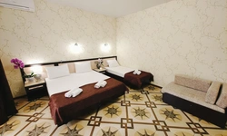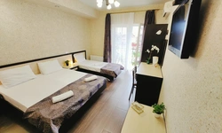 Просторный 5-ти местном номер с балконом. Номер оснащен всем необходимым: двуспальная кровать, односпальная кровать, двуспальный диван (120х200), прикроватная тумбочка, туалетный столик, журнальный столик, шкаф, ТВ, кондиционер, мини-холодильник, сушка. В номере своя ванная комната с душевой кабинкой.