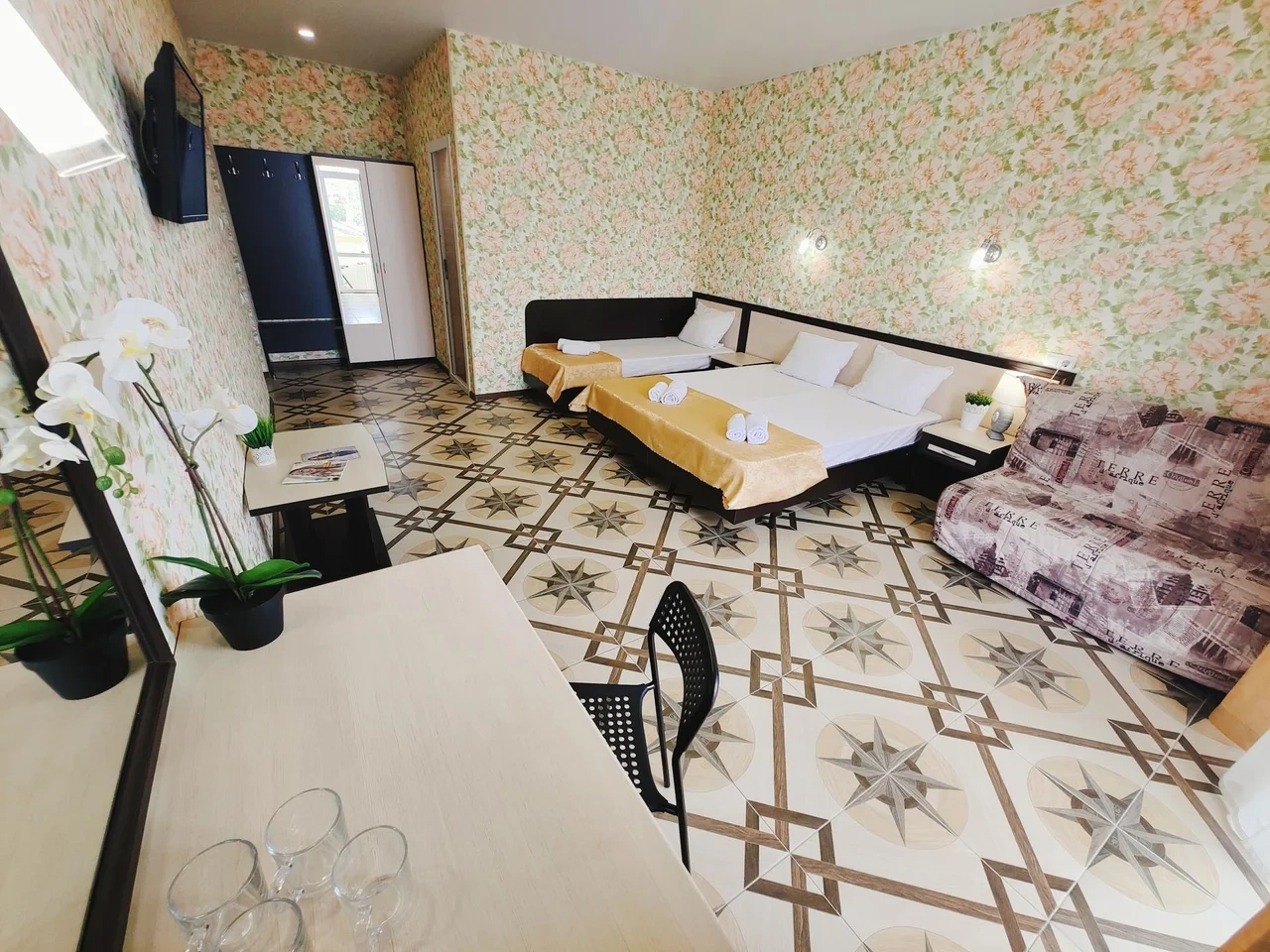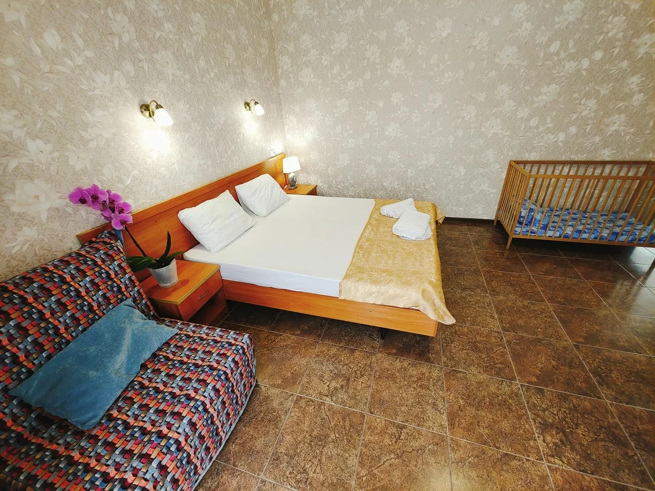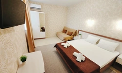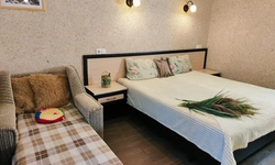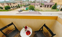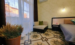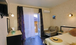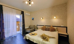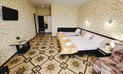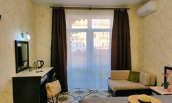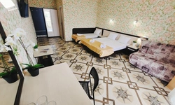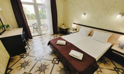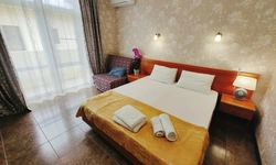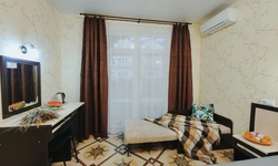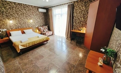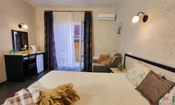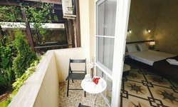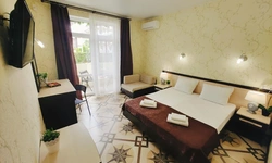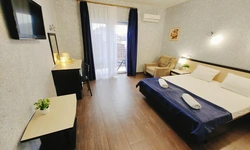 Просторный 3-х местный полулюкс с собственным двориком. В номере: двуспальная кровать, кресло-кровать, прикроватная тумбочка, туалетный столик, шкаф, ТВ, кондиционер, мини-холодильник, сушка. В номере своя ванная комната с душевой кабинкой. Индивидуальная терраса оборудована мебелью.
