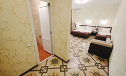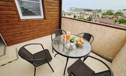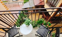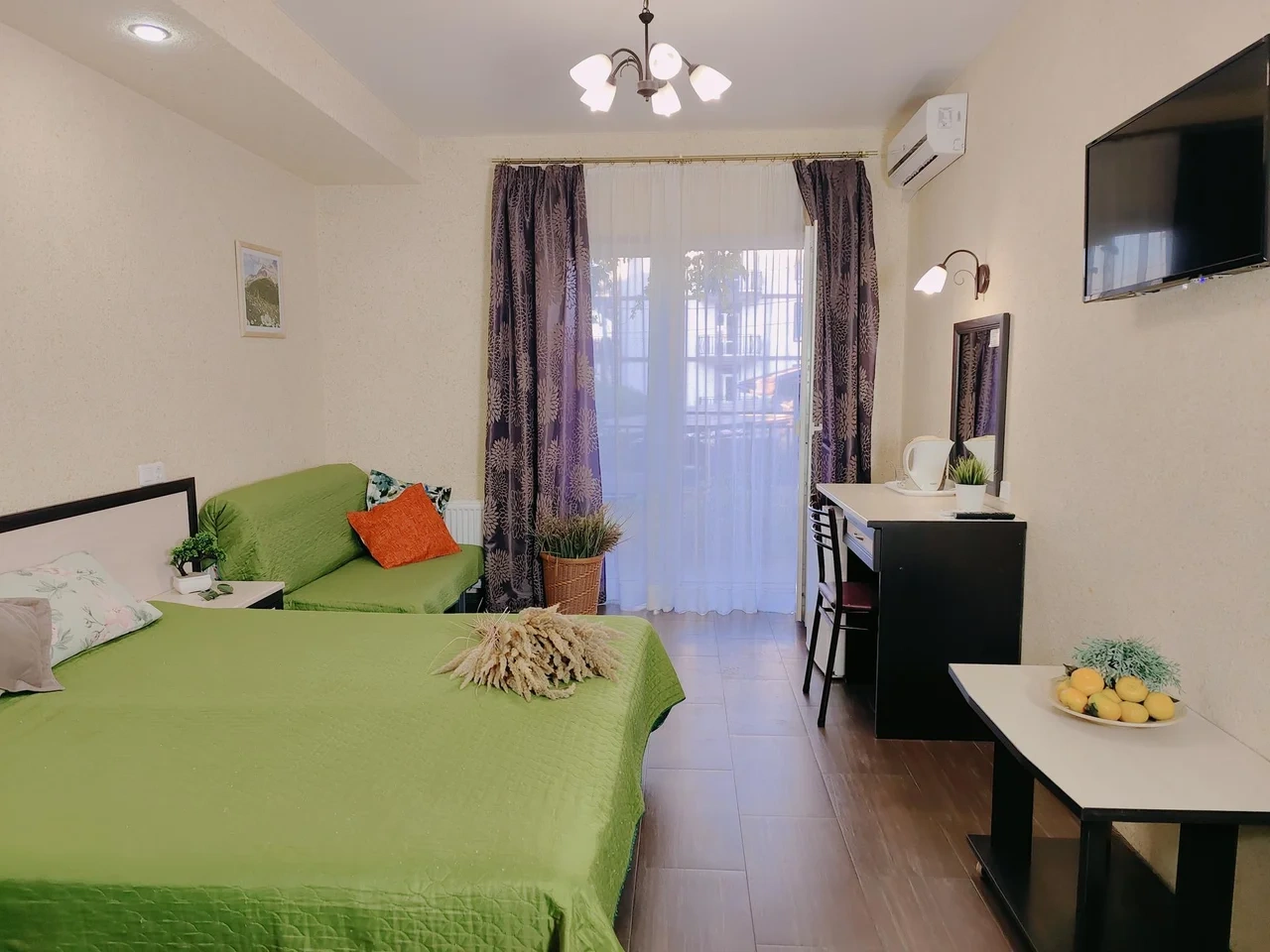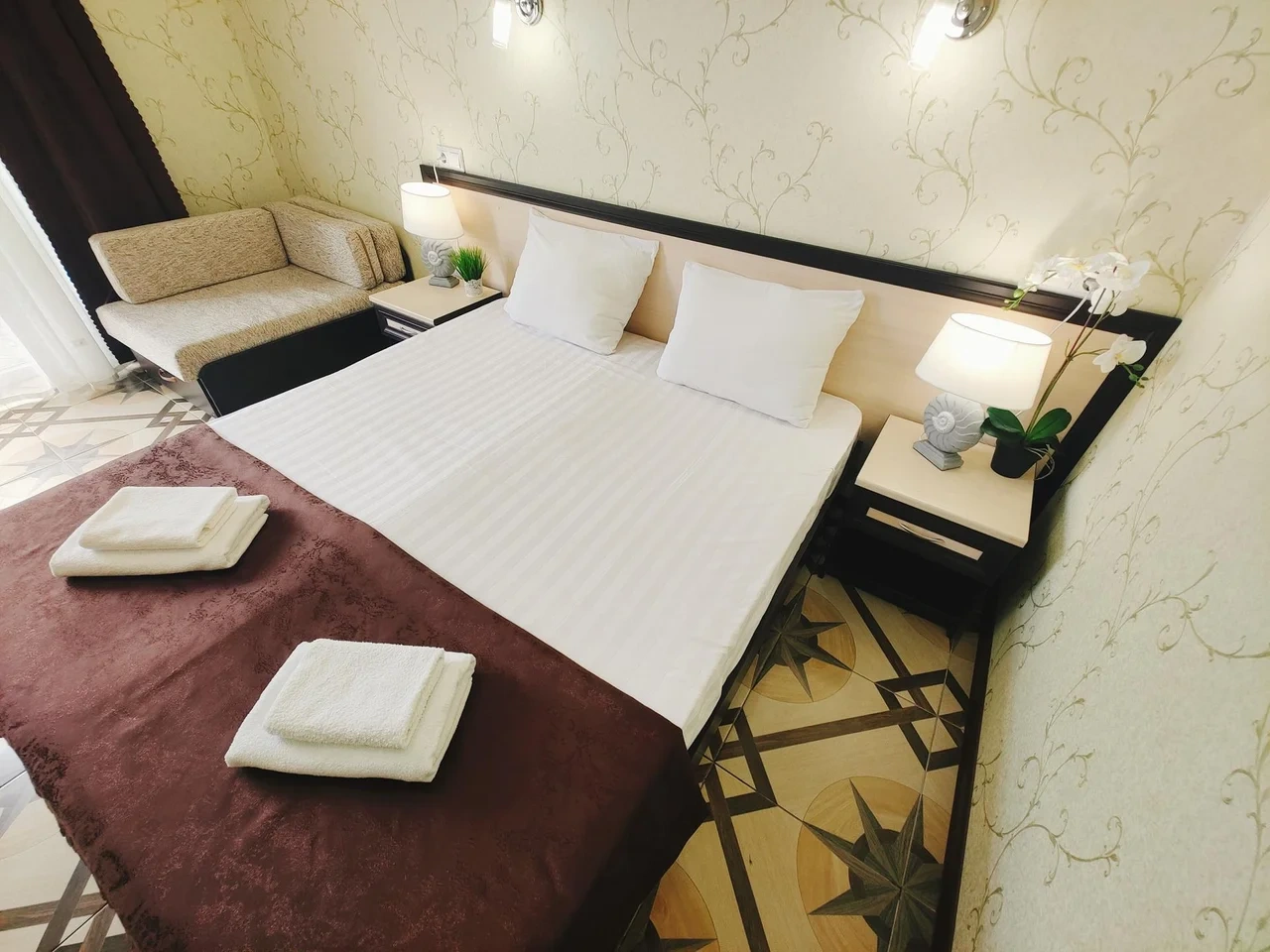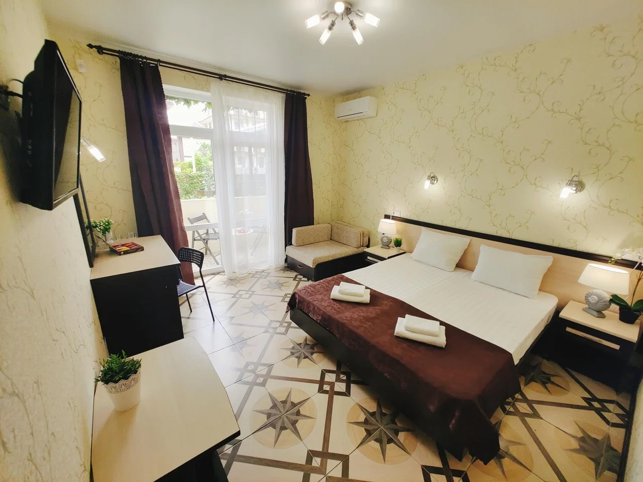 Просторный 3-х местный полулюкс с собственным двориком. В номере: двуспальная кровать, кресло-кровать, прикроватная тумбочка, туалетный столик, шкаф, ТВ, кондиционер, мини-холодильник, сушка. В номере своя ванная комната с душевой кабинкой. Индивидуальная терраса оборудована мебелью.