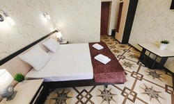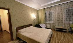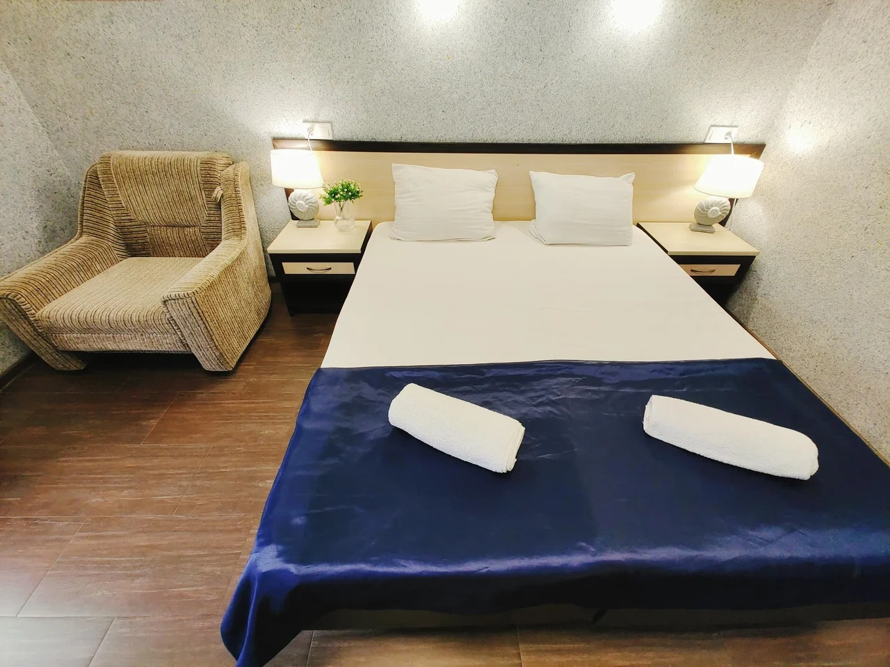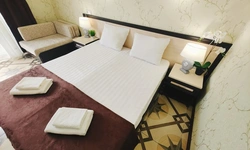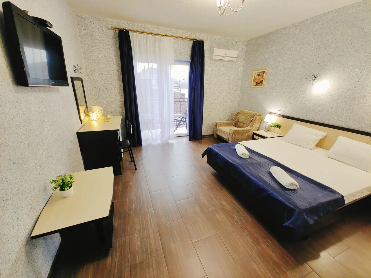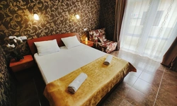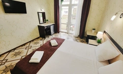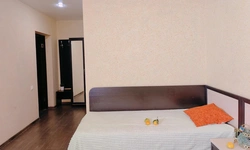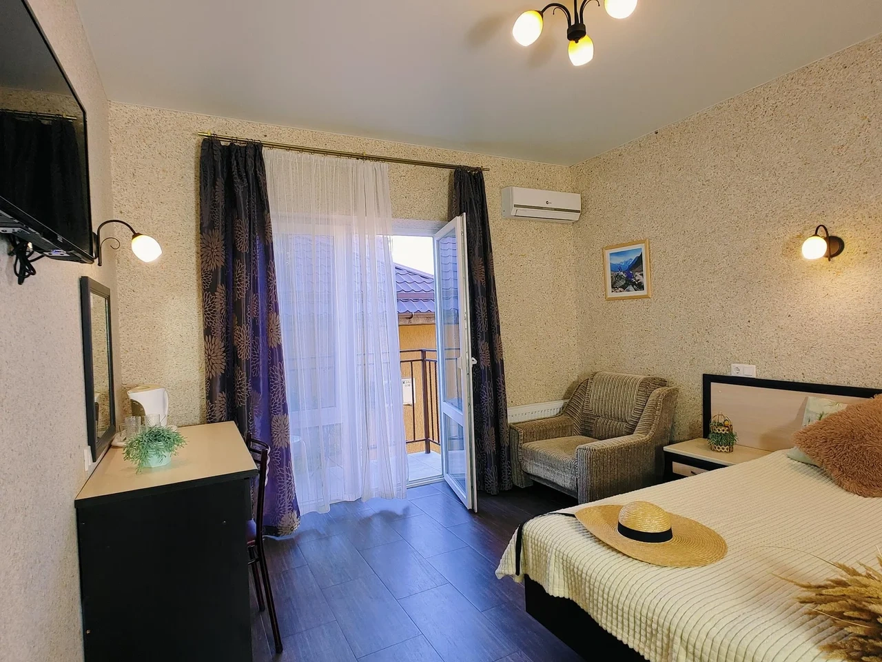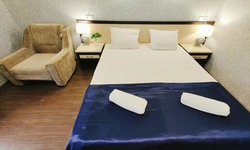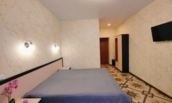 Просторный номер с двуспальной кроватью, прикроватной тумбочкой, туалетным столиком, вешалкой, шкафом. Для вашего комфорта номер оснащен кондиционером, мини-холодильником, телевизором. В номере своя ванная комната с душевой кабинкой, балкон.