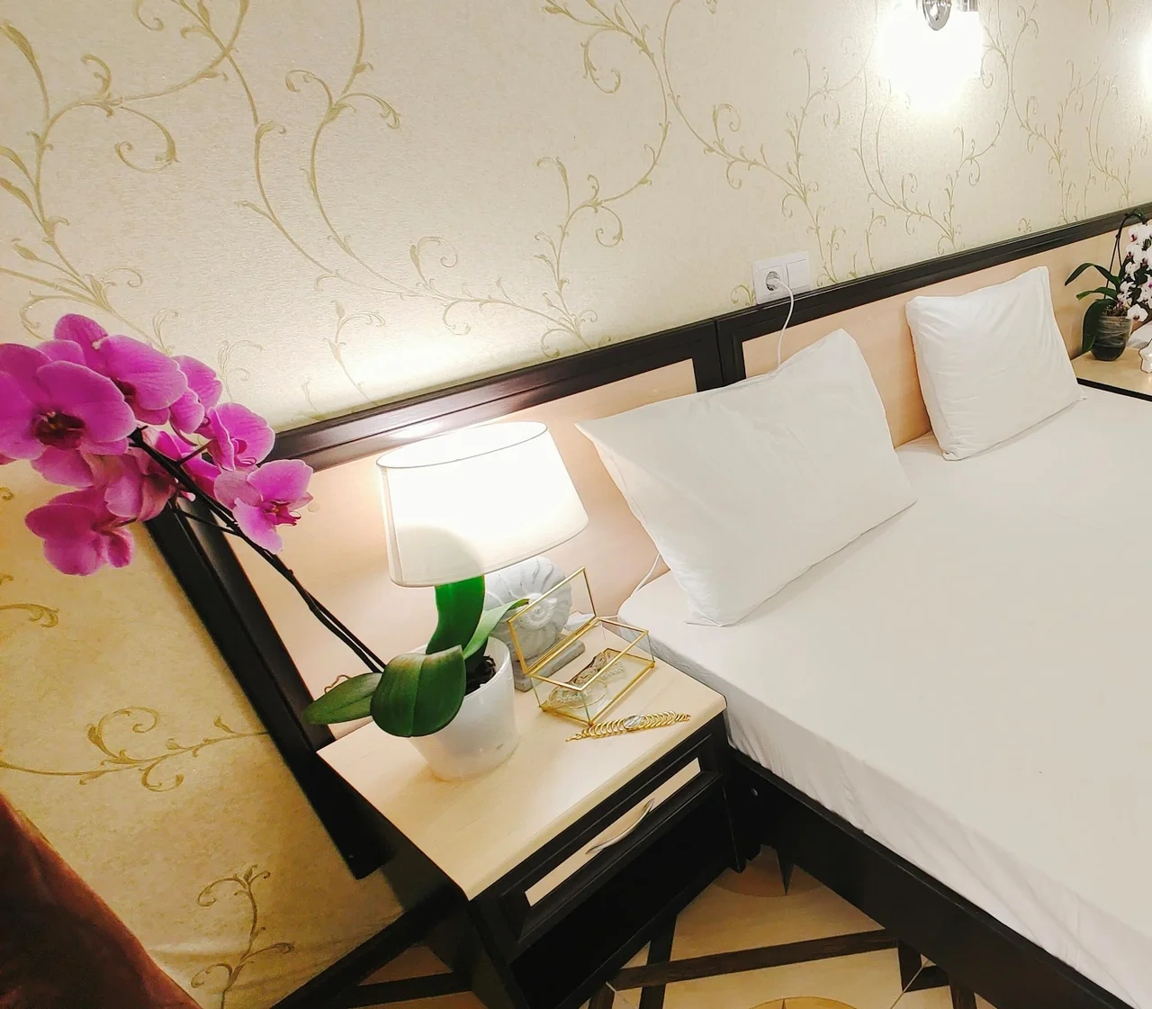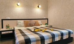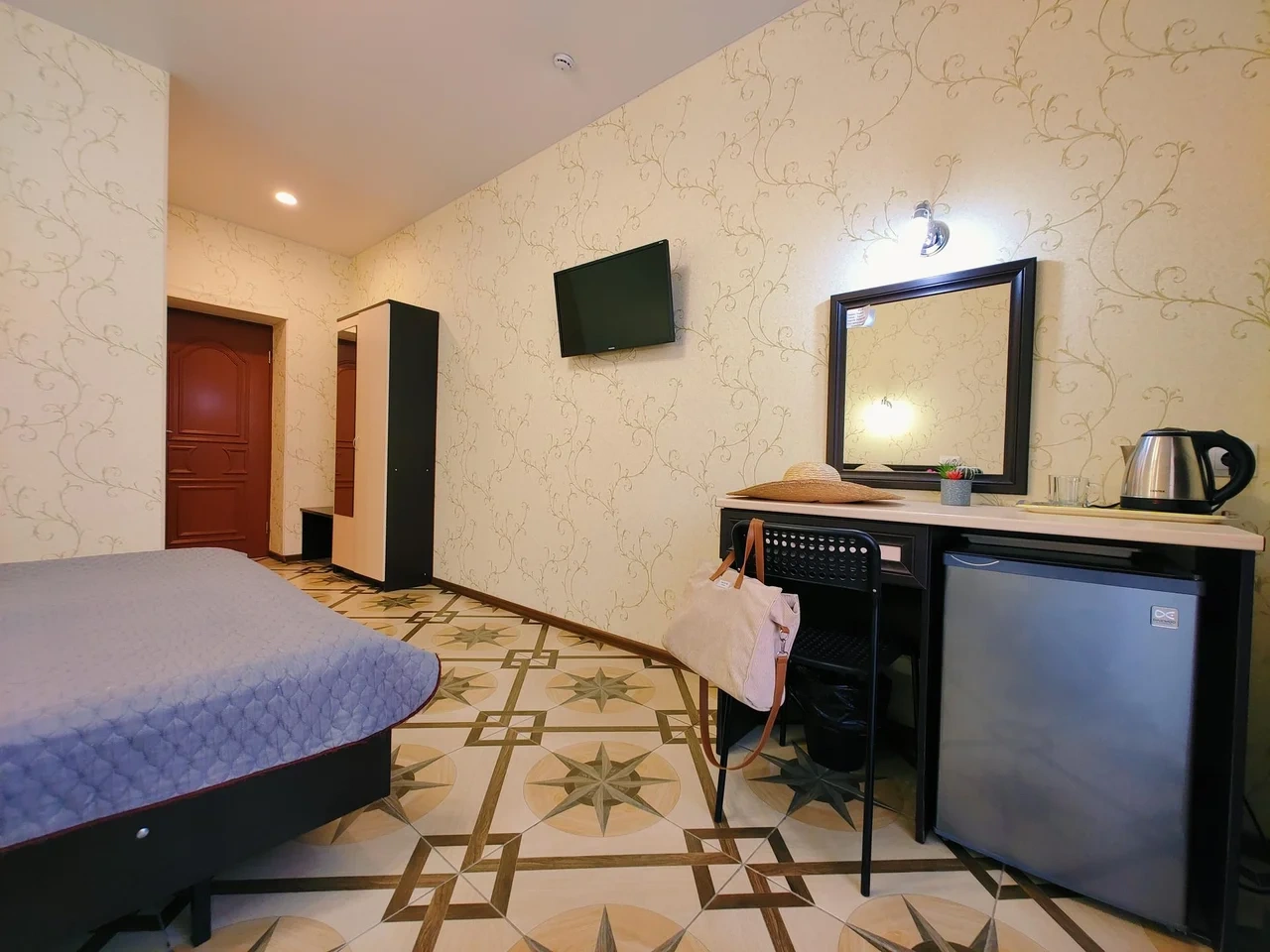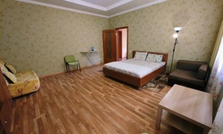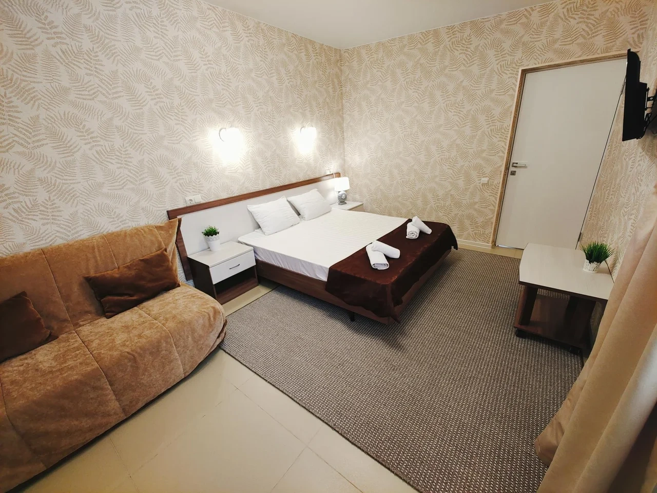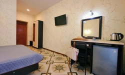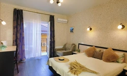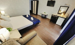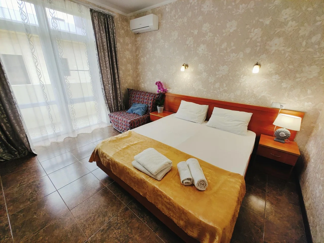 Просторный номер с двуспальной кроватью, прикроватной тумбочкой, туалетным столиком, вешалкой, шкафом. Для вашего комфорта номер оснащен кондиционером, мини-холодильником, телевизором. В номере своя ванная комната с душевой кабинкой, балкон.
