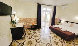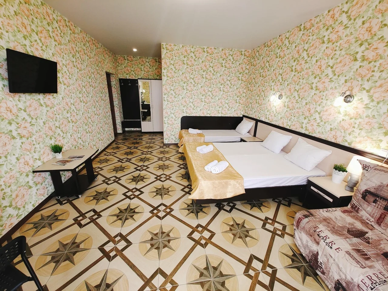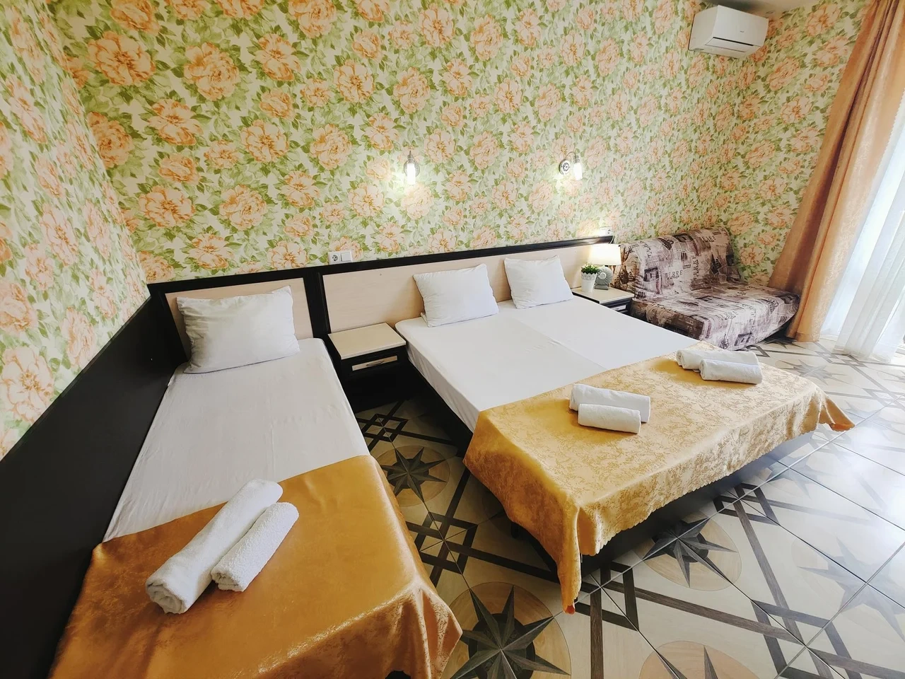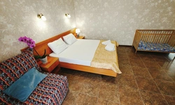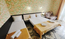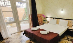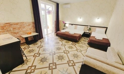 Прекрасный 4-х местный номер с индивидуальным двориком, оборудованной мебелью для отдыха. В номере: двуспальная кровать, односпальная кровать, кресло-кровать, прикроватная тумбочка, туалетный столик, шкаф, ТВ, кондиционер, мини-холодильник, сушка. В номере своя ванная комната с душевой кабинкой.