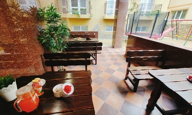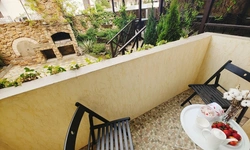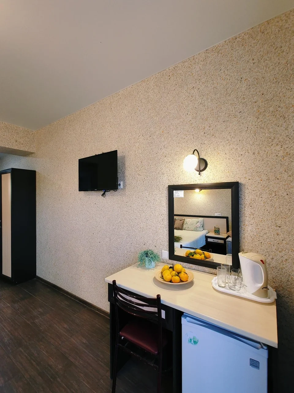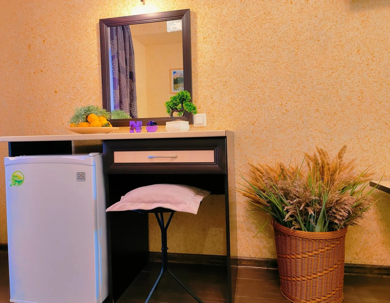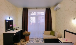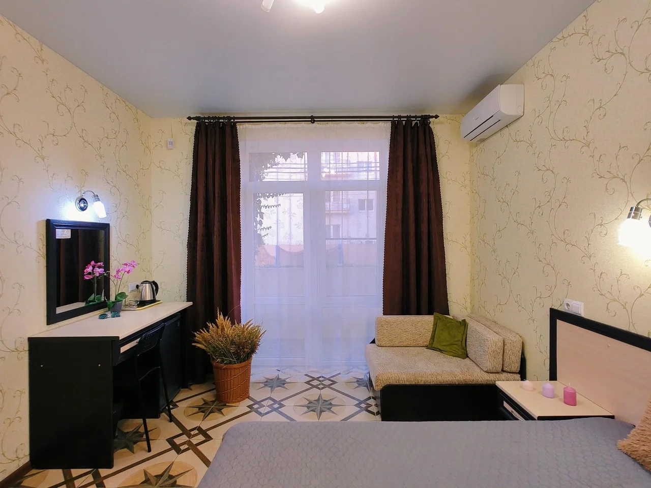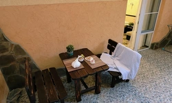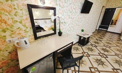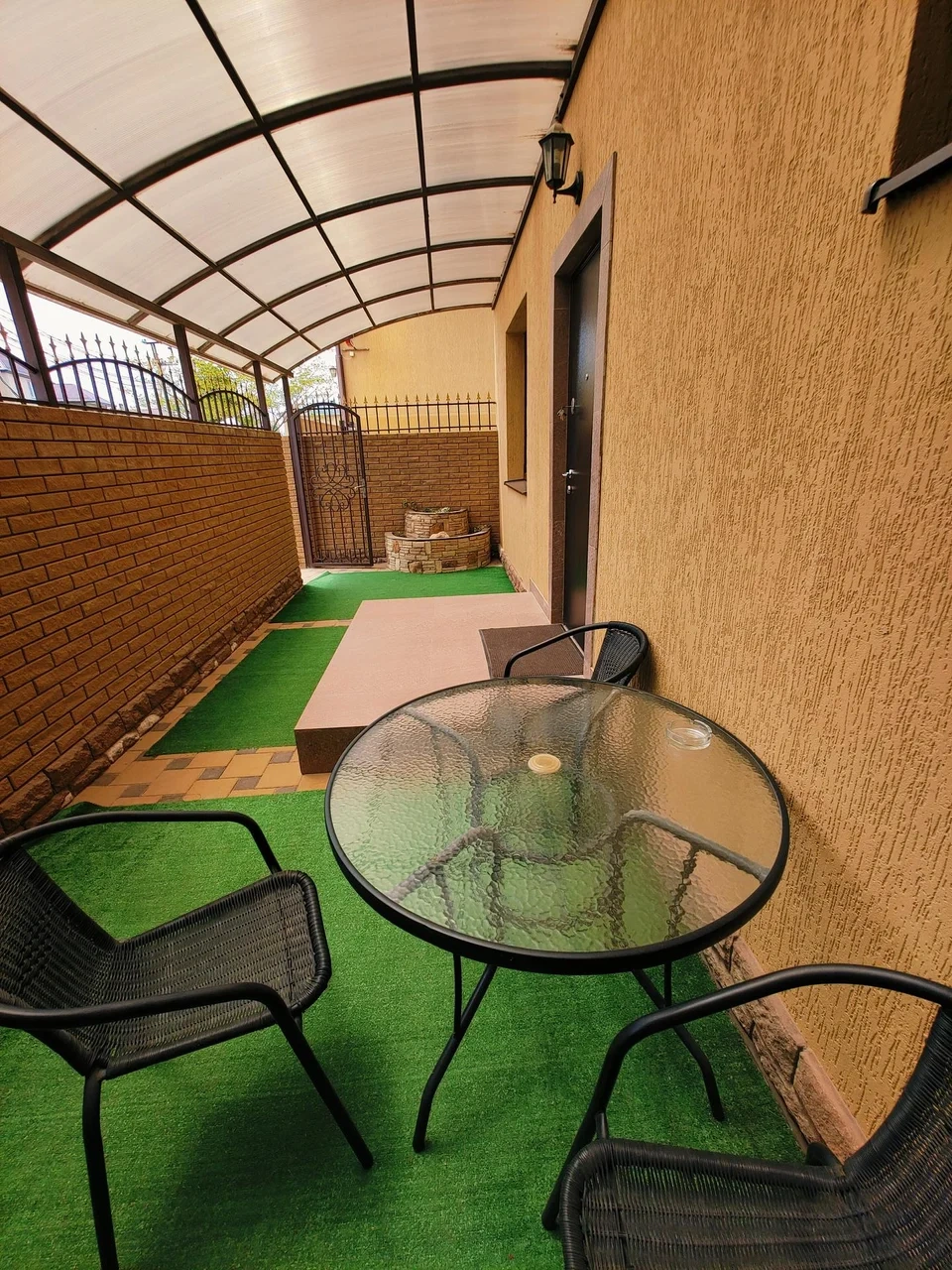 Уютный 2-х местный номер с индивидуальным двориком В номере находится: двуспальная кровать, прикроватная тумбочка, туалетный столик, шкаф, ТВ, кондиционер, мини-холодильник, чайник, сушка. Ванная комната с душевой кабинкой.