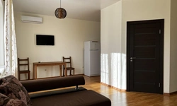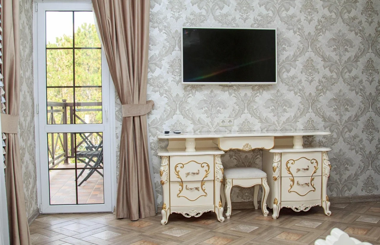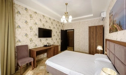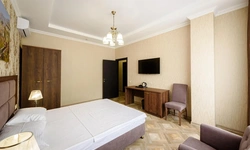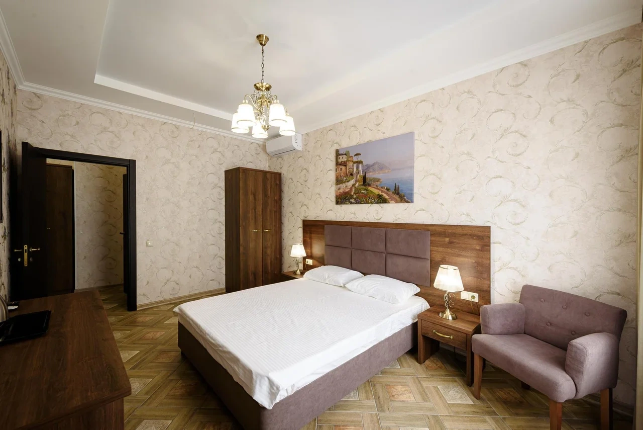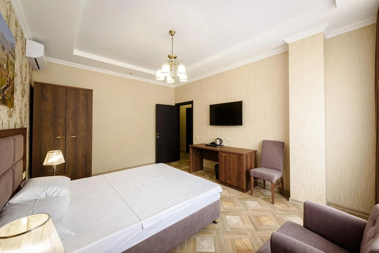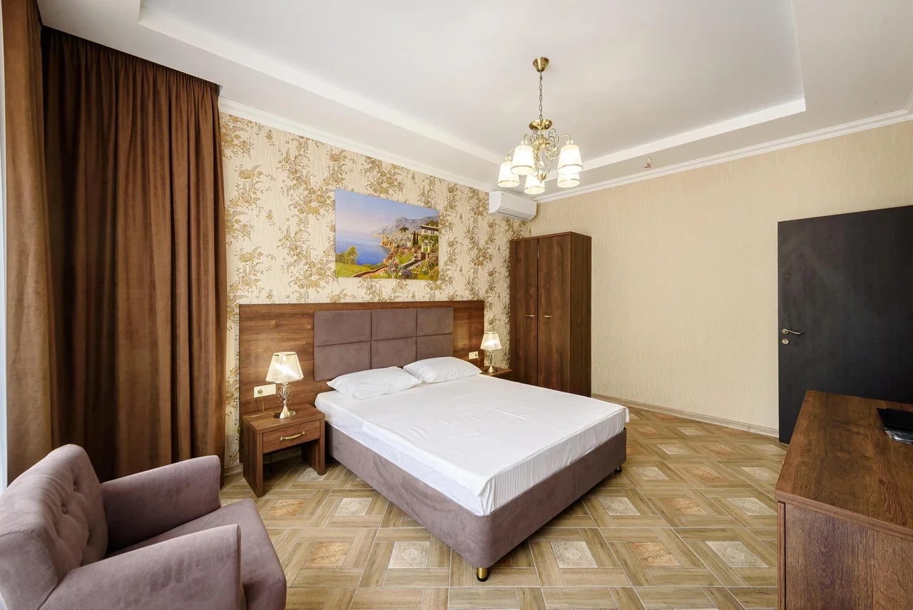 2-ух комнатный номер площадью 35м² на 1 этаже главного корпуса с балконом для 2-ух взрослых В номере: 2-ух спальная кровать размера «king size», шкаф для одежды, рабочий стол, кресло, мини-холодильник, чайник, чайная пара, кондиционер, москитные сетки, спутниковое TV, бесплатный wi-fi. Во второй комнате - кухонный гарнитур с варочной панелью, чайник, посуда (тарелки, чашки, ложки, вилки, ножи, доска разделочная), стол, стулья, большой холодильник, стиральная машина. Санузел, душ, фен, тапочки, набор косметики и гигиенических принадлежностей. В стоимость проживания также входит: посещение открытого бассейна, пользование беседкой, парковка. Подарок в день рождения, в честь свадьбы. Возможность заказать горячее питание 24/7