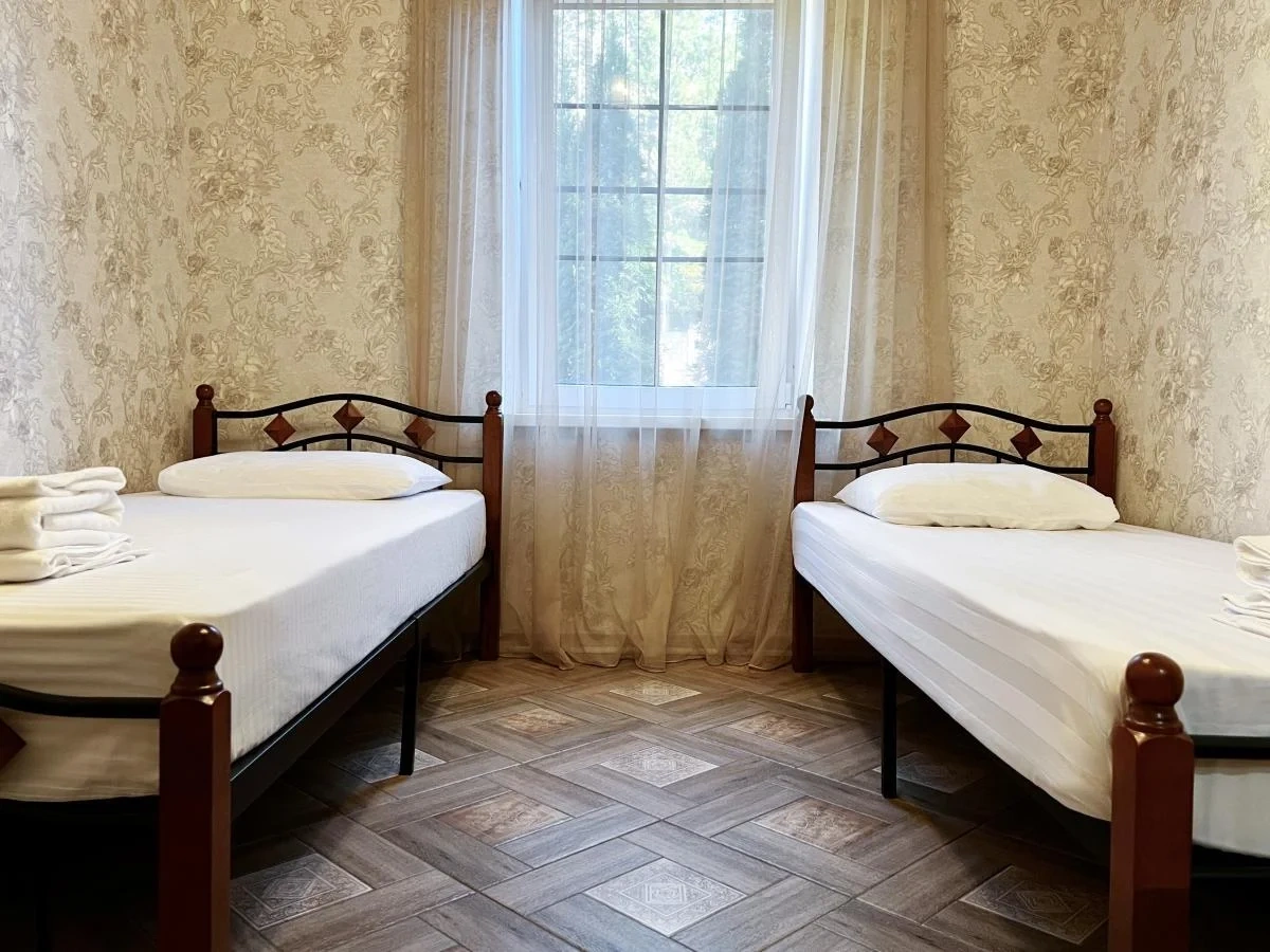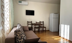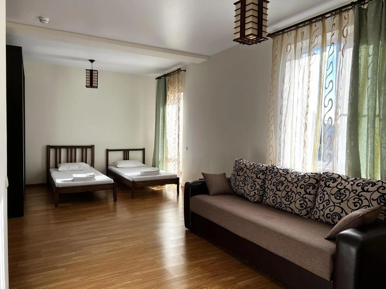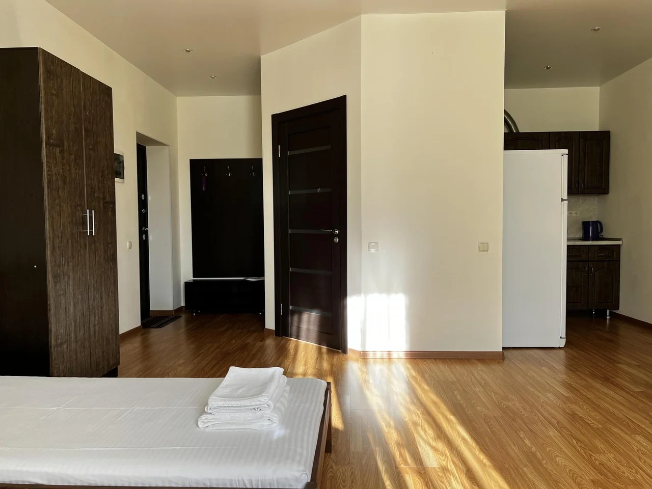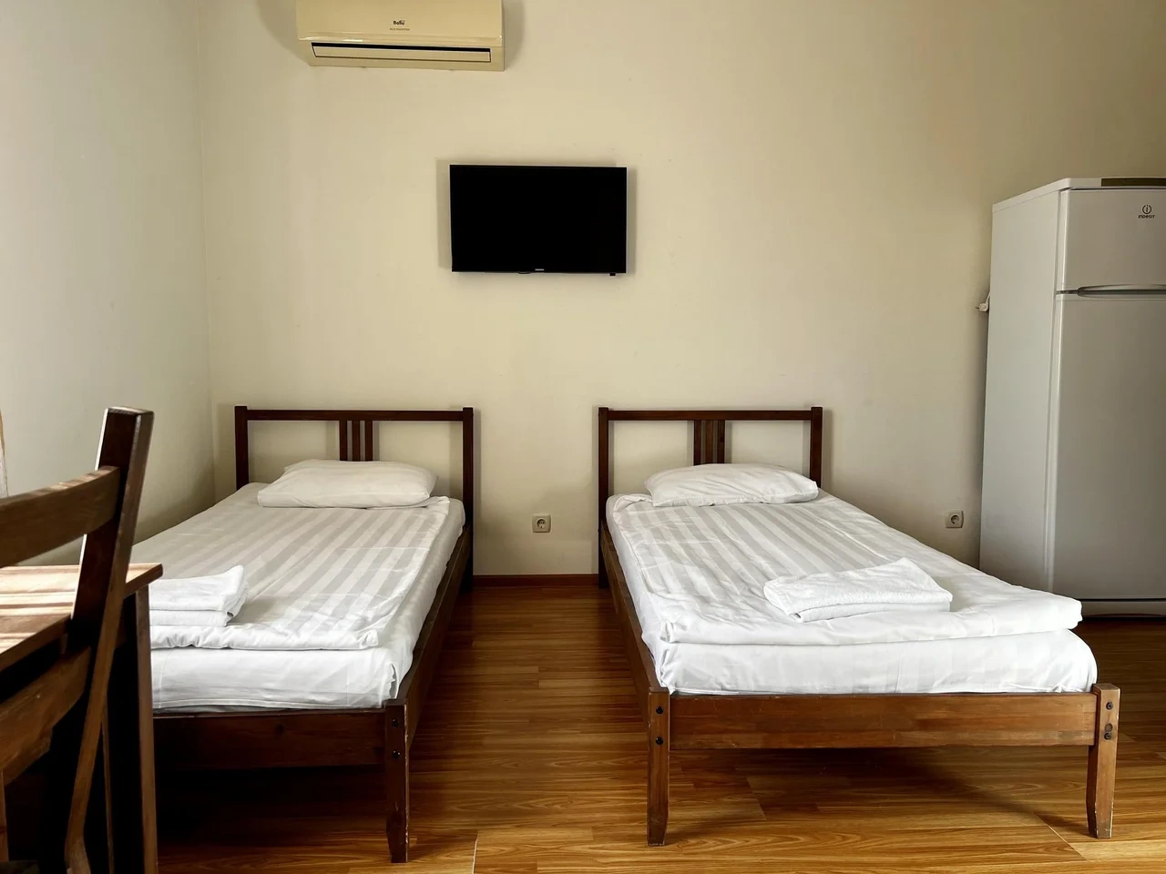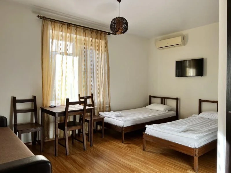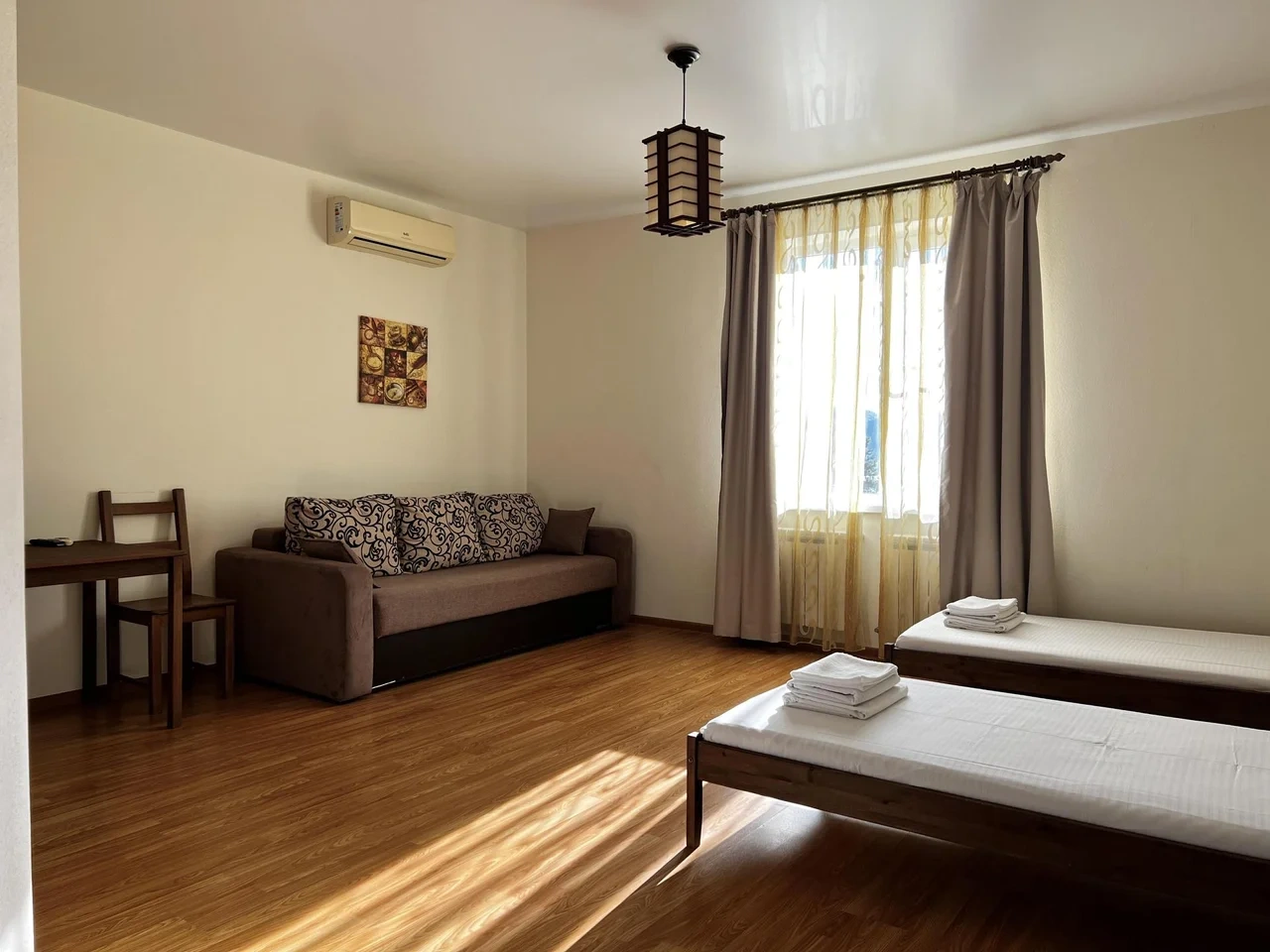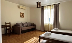 Два однокомнатных номера площадью 26,1 и 27,2 м² на 1 этаже верхнего корпуса с видом на внутренний двор вместимостью до 4 человек. Без балкона. В номере: 2 раздельные односпальные кровати, 2-ух местный раскладной диван, шкаф для одежды, кондиционер, москитные сетки, спутниковое TV, бесплатный wi-fi. Кухонный гарнитур с варочной панелью, холодильник, стол, стулья, чайник, посуда для 4 персон (тарелки, чашки, ложки, вилки, ножи, доска разделочная, кастрюля, сковорода). Санузел, душевая кабина, стиральная машина, тапочки. Фен предоставляется по запросу. В стоимость проживания также входит: посещение открытого бассейна, пользование беседкой, парковка. Подарок в день рождения, в честь свадьбы. Возможность заказать горячее питание 24/7