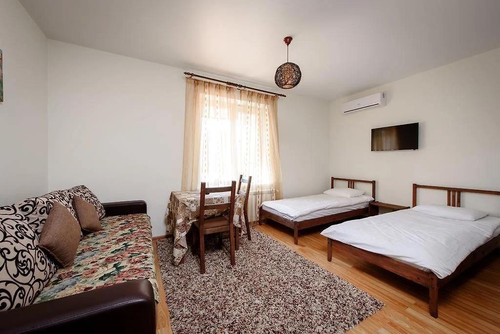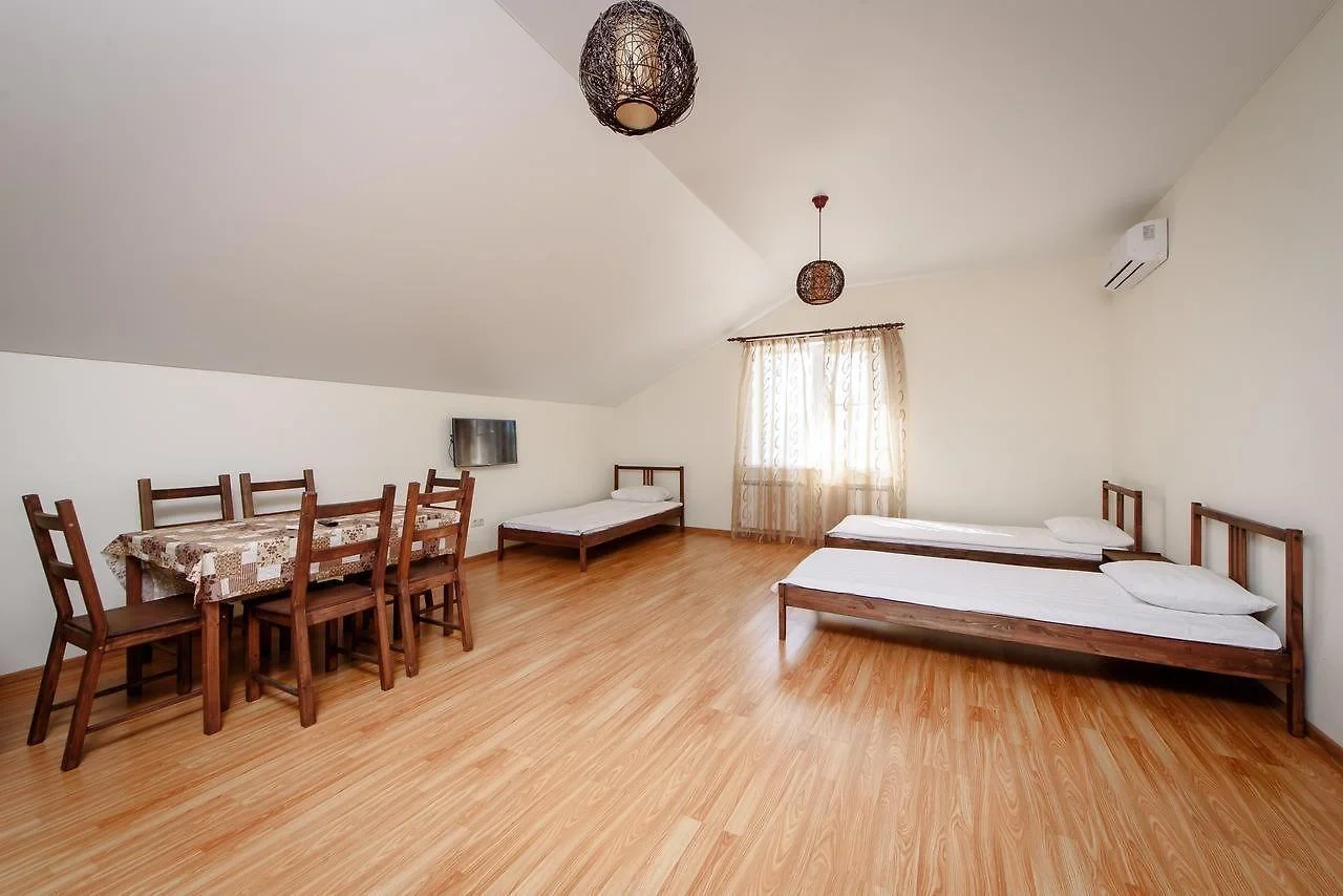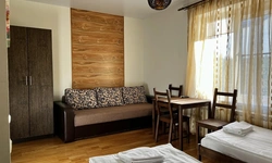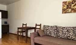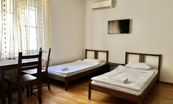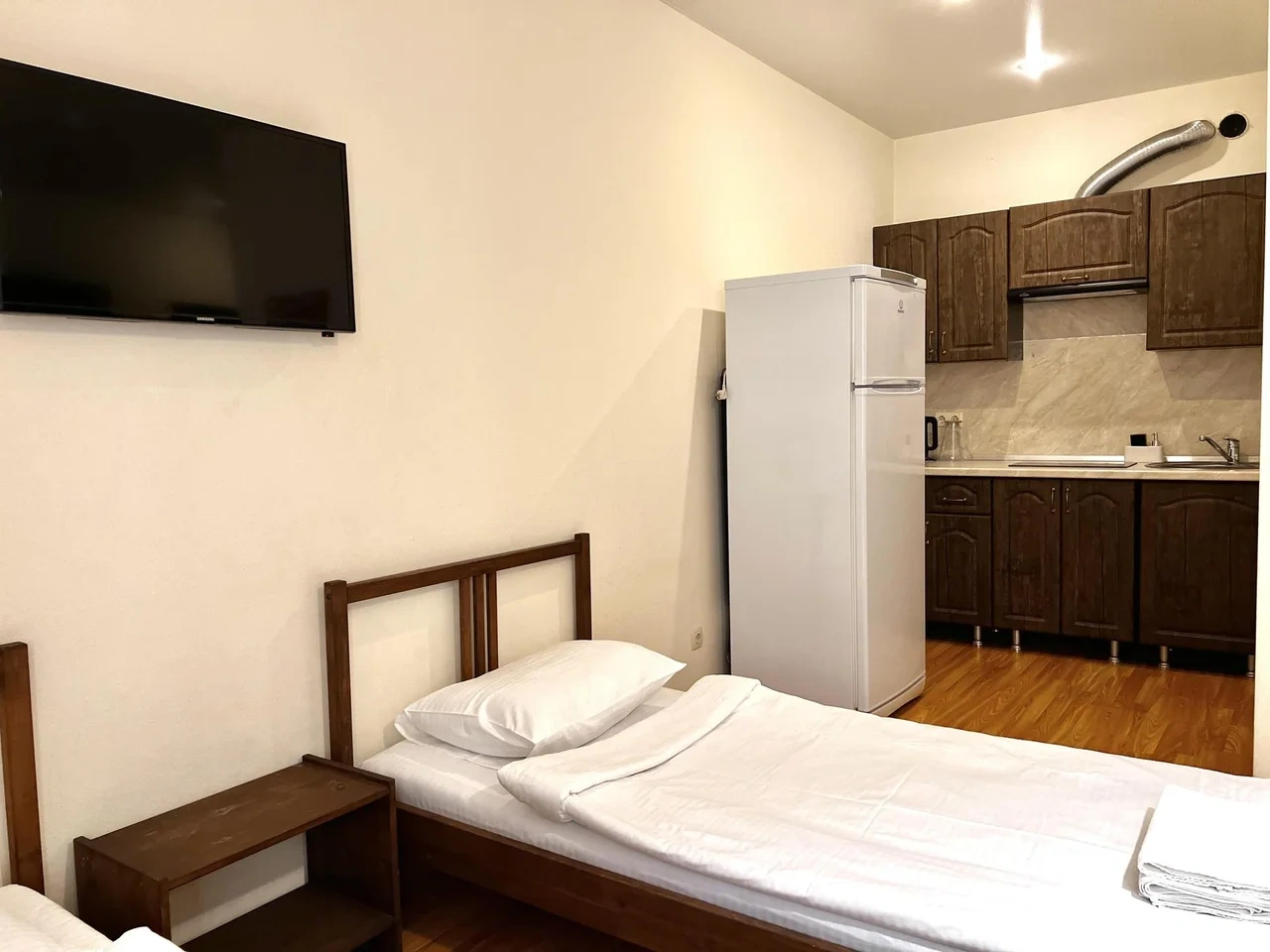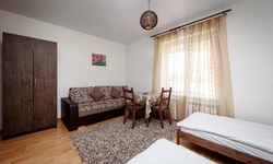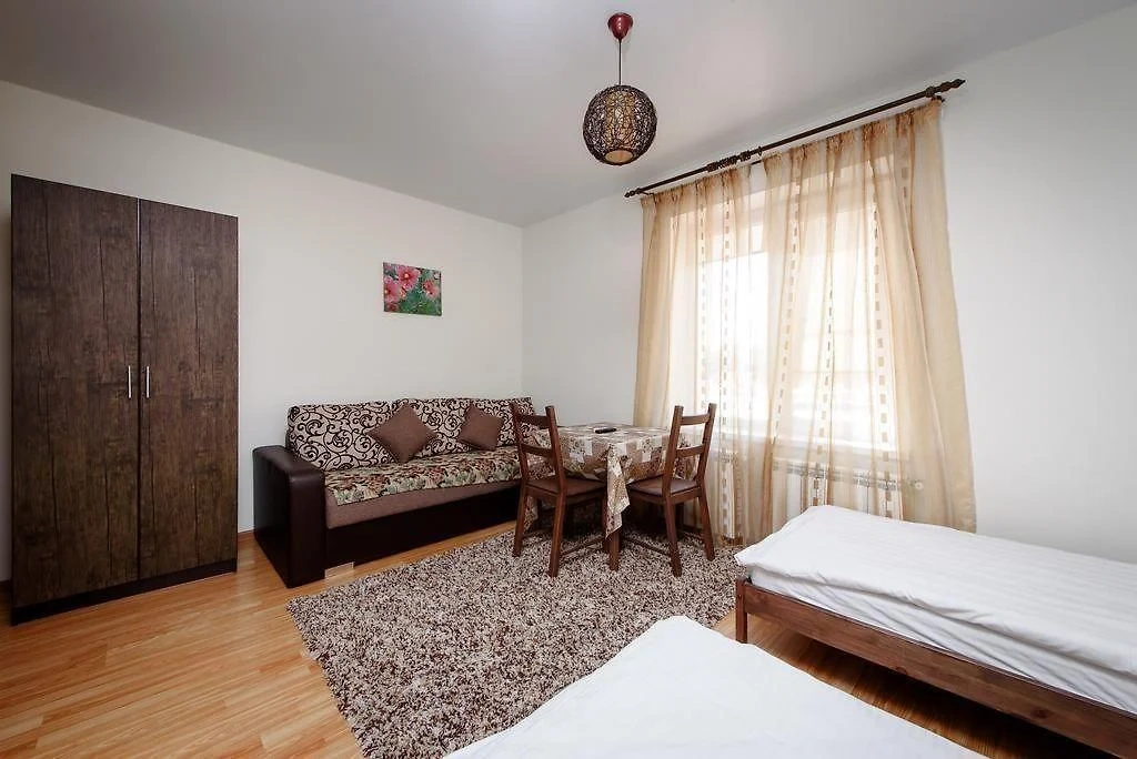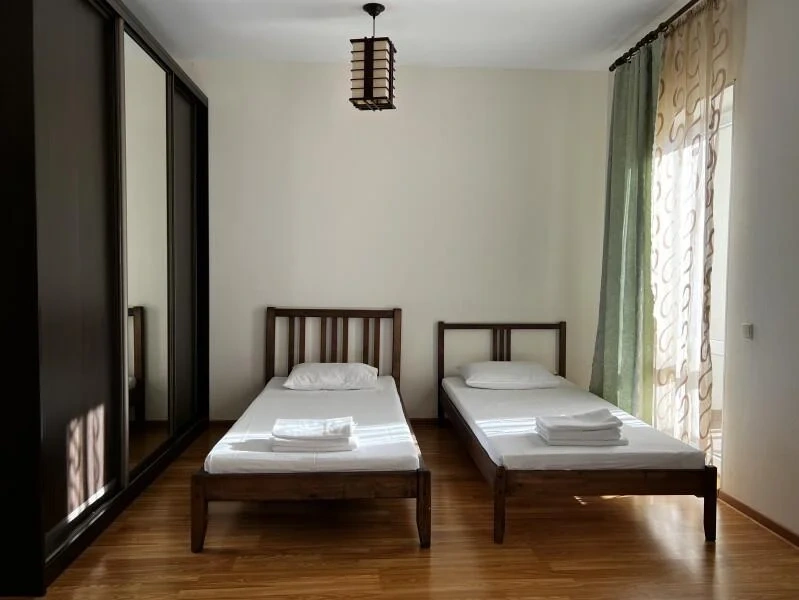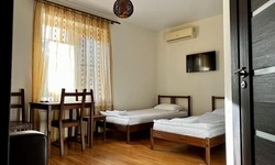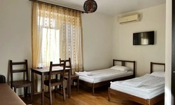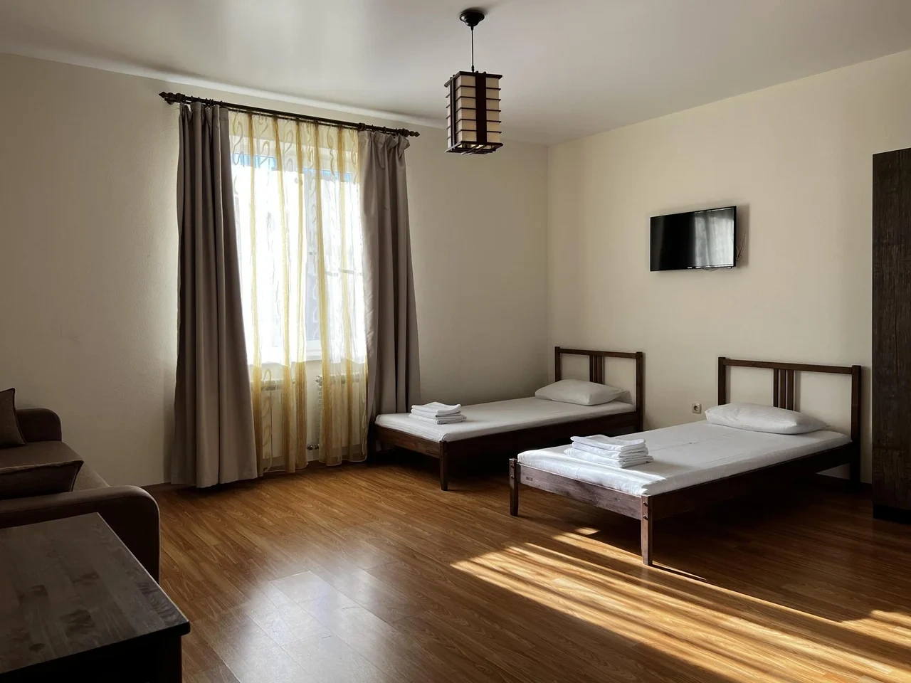 Два однокомнатных номера площадью 26,1 и 27,2 м² на 1 этаже верхнего корпуса с видом на внутренний двор вместимостью до 4 человек. Без балкона. В номере: 2 раздельные односпальные кровати, 2-ух местный раскладной диван, шкаф для одежды, кондиционер, москитные сетки, спутниковое TV, бесплатный wi-fi. Кухонный гарнитур с варочной панелью, холодильник, стол, стулья, чайник, посуда для 4 персон (тарелки, чашки, ложки, вилки, ножи, доска разделочная, кастрюля, сковорода). Санузел, душевая кабина, стиральная машина, тапочки. Фен предоставляется по запросу. В стоимость проживания также входит: посещение открытого бассейна, пользование беседкой, парковка. Подарок в день рождения, в честь свадьбы. Возможность заказать горячее питание 24/7