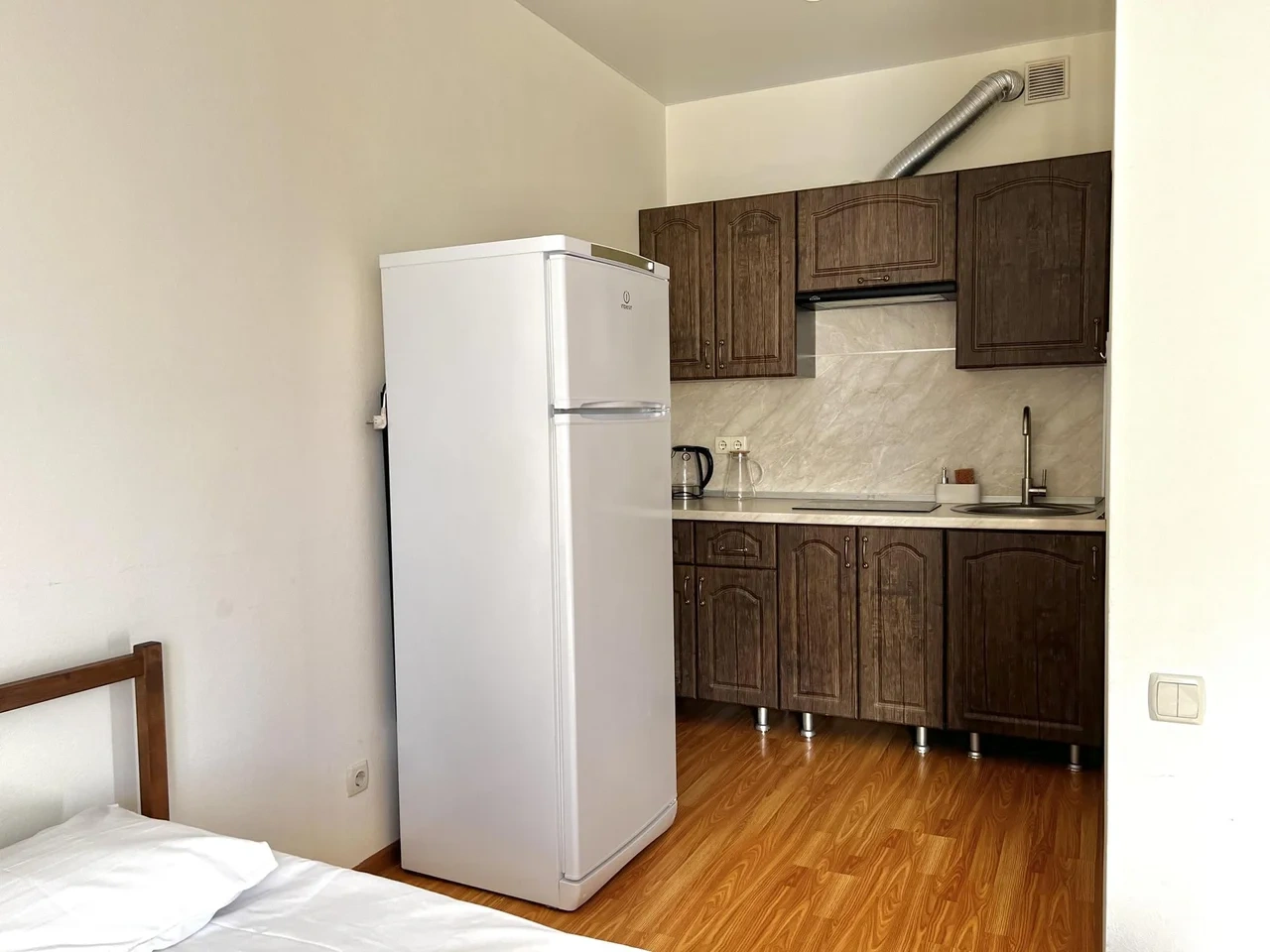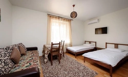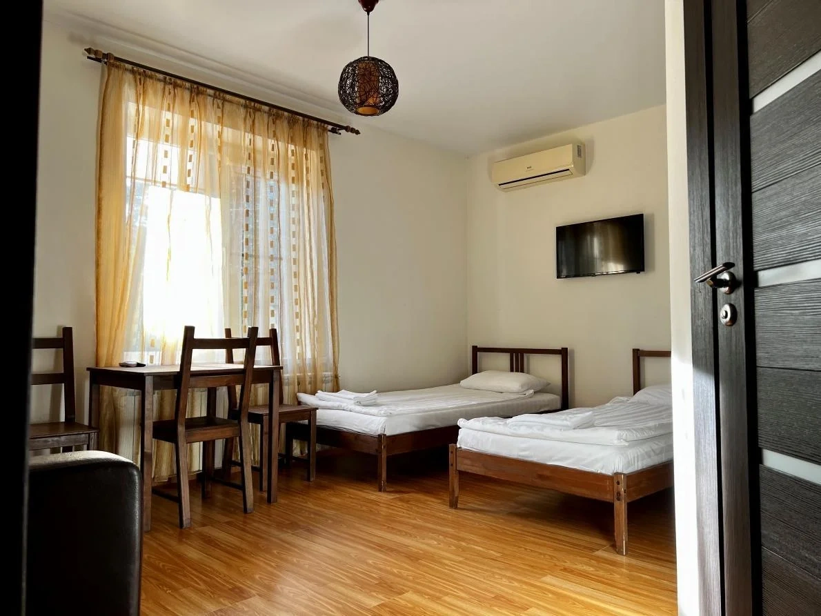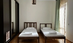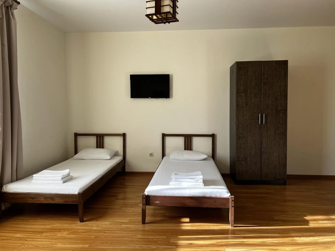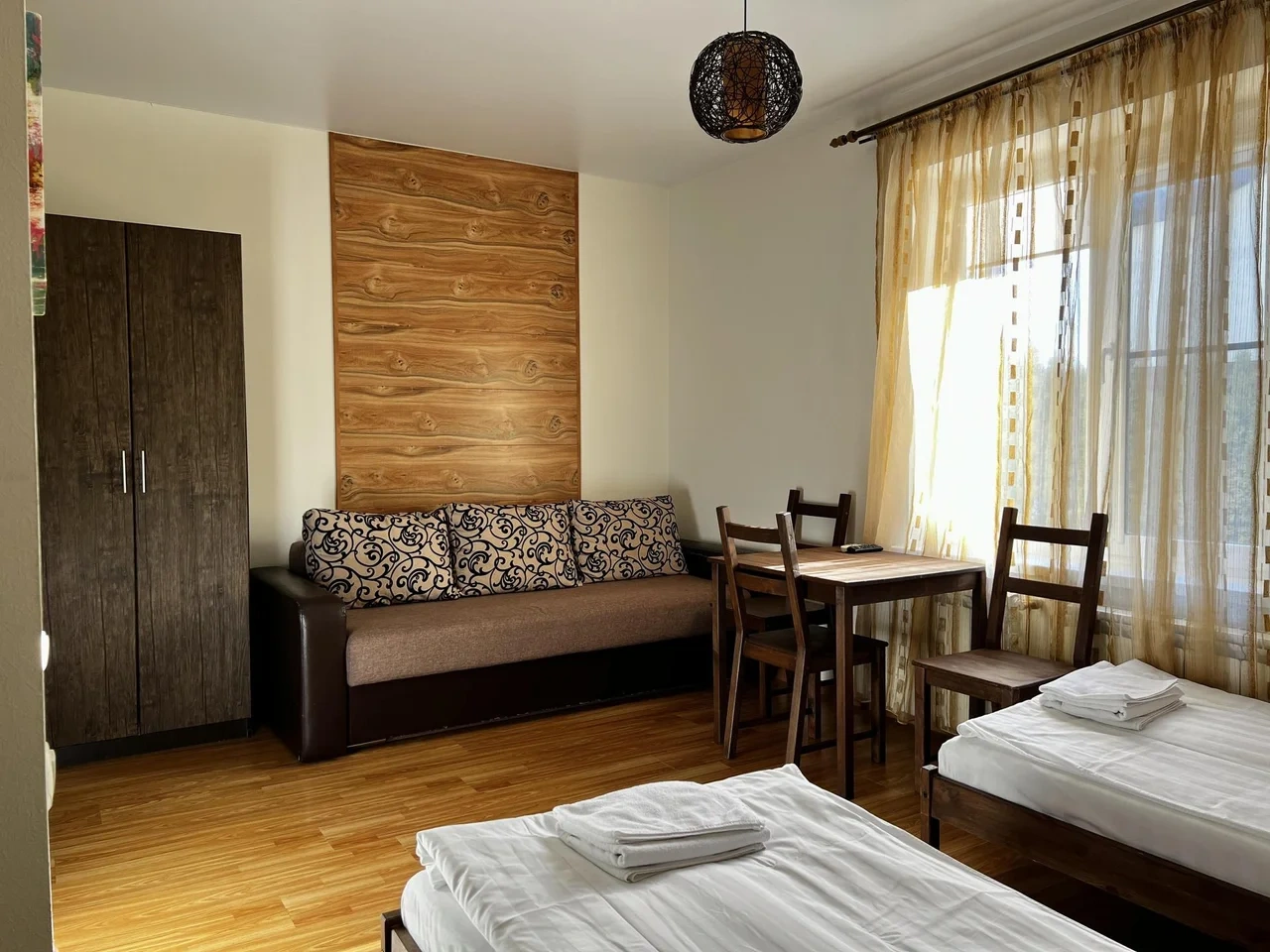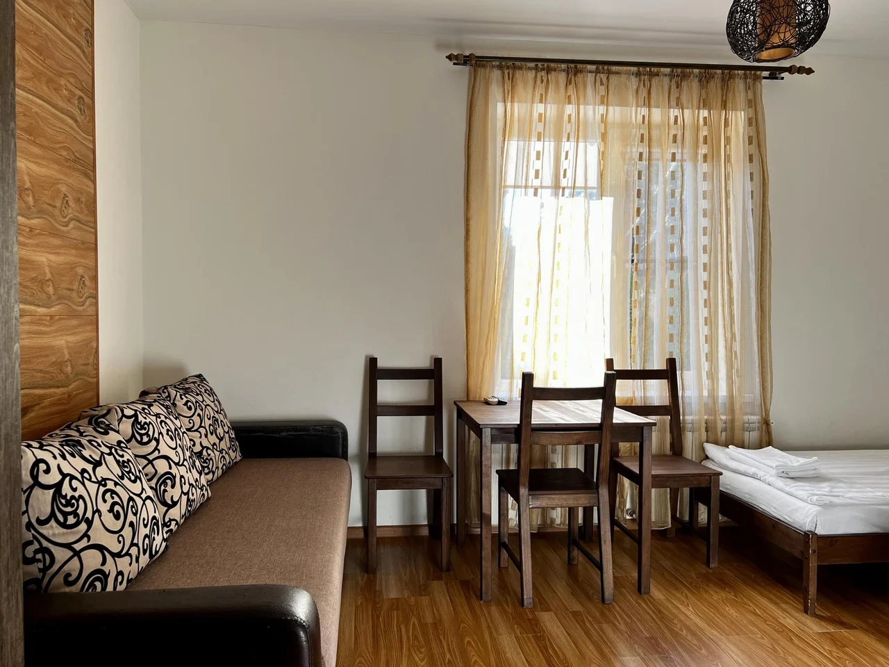 Два однокомнатных номера площадью 26,1 и 27,2 м² на 1 этаже верхнего корпуса с видом на внутренний двор вместимостью до 4 человек. Без балкона. В номере: 2 раздельные односпальные кровати, 2-ух местный раскладной диван, шкаф для одежды, кондиционер, москитные сетки, спутниковое TV, бесплатный wi-fi. Кухонный гарнитур с варочной панелью, холодильник, стол, стулья, чайник, посуда для 4 персон (тарелки, чашки, ложки, вилки, ножи, доска разделочная, кастрюля, сковорода). Санузел, душевая кабина, стиральная машина, тапочки. Фен предоставляется по запросу. В стоимость проживания также входит: посещение открытого бассейна, пользование беседкой, парковка. Подарок в день рождения, в честь свадьбы. Возможность заказать горячее питание 24/7