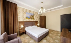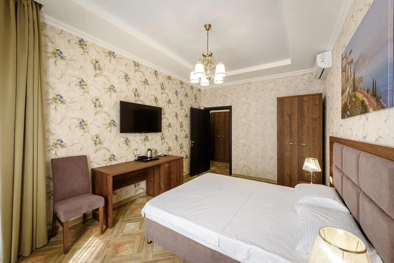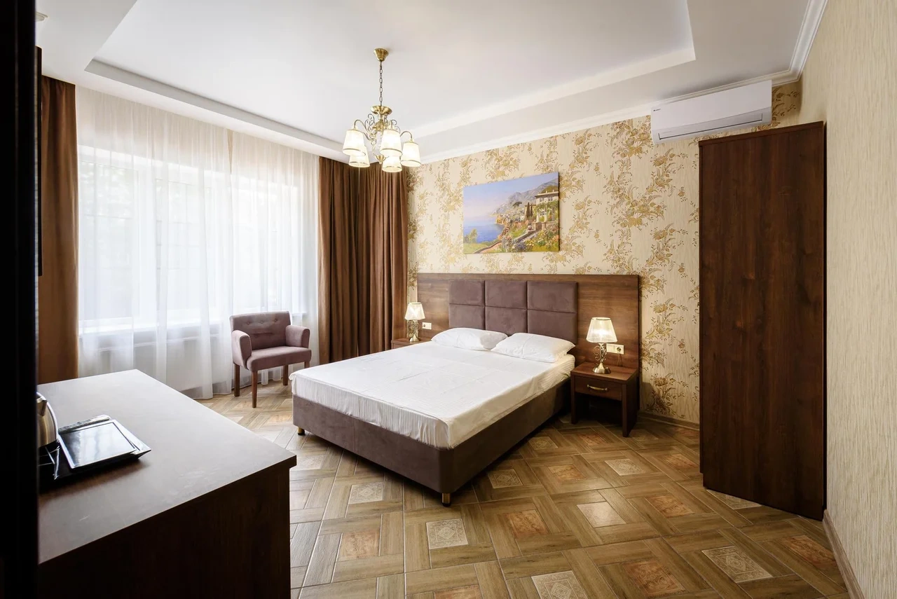 Два 2-ух комнатных номера площадью 35,3 м² на 2 или 3 этаже главного корпуса с балконом, вместимостью до 2 человек ( возможно проживание с питомцем до 5 кг) В номере: 2-ух спальная кровать размера «king size», шкаф для одежды, рабочий стол, кресло, минибар, чайник, чайная пара, кондиционер, москитные сетки, спутниковое TV, бесплатный wi-fi. Вторая комната свободна. Санузел, душ, фен, тапочки, набор косметики и гигиенических принадлежностей. В стоимость проживания также входит: посещение открытого бассейна, пользование беседкой, парковка. Подарок в день рождения, в честь свадьбы. Возможность заказать горячее питание 24/7