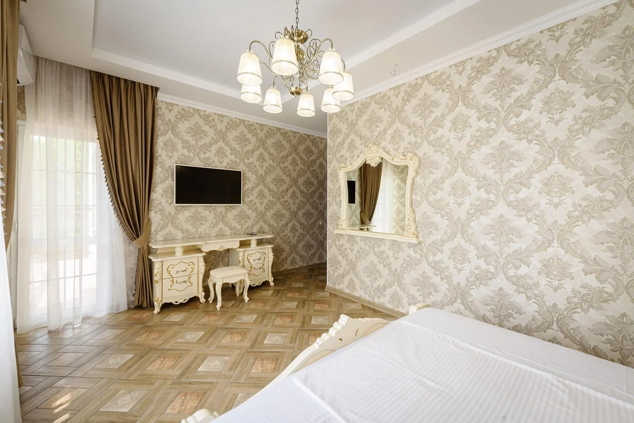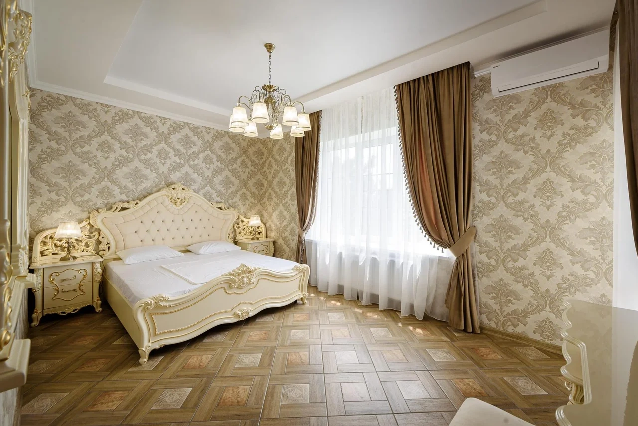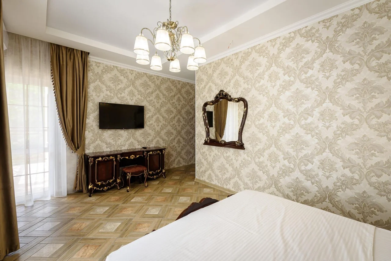 Два роскошных 2-ух комнатных номера площадью 39,5 м² на 2 или 3 этаже главного корпуса с белой или темной мебелью уровня люкс с балконом, вместимостью до 4 человек. В номере: 2-ух спальная кровать размера «king size», кондиционер, шкаф для одежды, невероятно комфортный 2ух местный раскладной диван, мини-холодильник, чайная станция, спутниковое TV, москитные сетки, бесплатный wi-fi. Санузел, душ, фен, тапочки, набор косметики и гигиенических принадлежностей. В стоимость проживания также входит: посещение открытого бассейна, пользование беседкой, парковка. Подарок в день рождения, в честь свадьбы. Возможность заказать горячее питание 24/7
