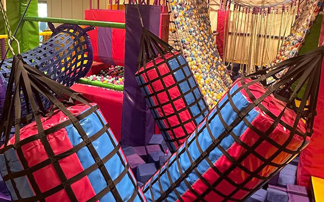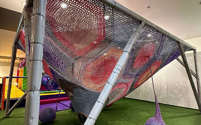 Площадка оборудована вязаным лабиринтом, подвесным сухим бассейном, горками, батутами и другими аттракционами. Также тут есть необычные карусели и пространство для спортивных игр (настольных и не только).